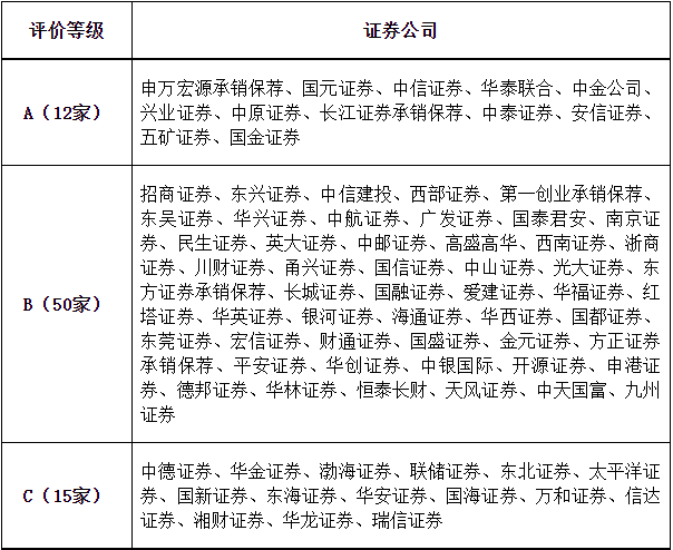 據(jù)中證協(xié)官網(wǎng)消息,12月9日,中證協(xié)發(fā)布2022年證券公司投行業(yè)務(wù)質(zhì)量評(píng)價(jià)結(jié)果的公告,12家公司被評(píng)為A類,50家公司被評(píng)為B類,15家公司被評(píng)為C類。
