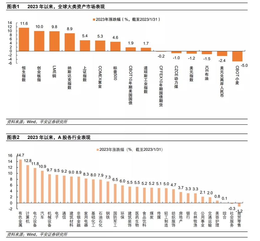 市場的短期邏輯得到了較好的印證和兌現(xiàn)。具體分析來看,第一,長期以來制約市場和經(jīng)濟的疫情因素大幅緩解。2023年疫情將不再成為市場的核心要素,相反疫情之后經(jīng)濟發(fā)展的動能何在,政府、企業(yè)、個人對于經(jīng)濟發(fā)展的訴求將逐漸成為市場的主要關注點;第二,經(jīng)濟在復蘇期有利于權益資產的格局不變。在確認了2022年四季度(受疫情影響)較低的增速之后(投資、消費、進出口全方位的滑落),2023年一季度中國經(jīng)濟正式進入修復及復蘇階段,這不僅僅是預期先行,也是海內外的共識(關系到海外資金的持續(xù)流入);第三,結構上出行消費、服務消費先行,投資、制造等領域也將加快投入力度。1月份及春節(jié)期間市場關注的高頻數(shù)據(jù),包括旅游、影視、出行等方面數(shù)據(jù)給予了市場一定的信心,平安證券判斷后續(xù)在制造業(yè)、投資等數(shù)據(jù)上也會出現(xiàn)好的變化。