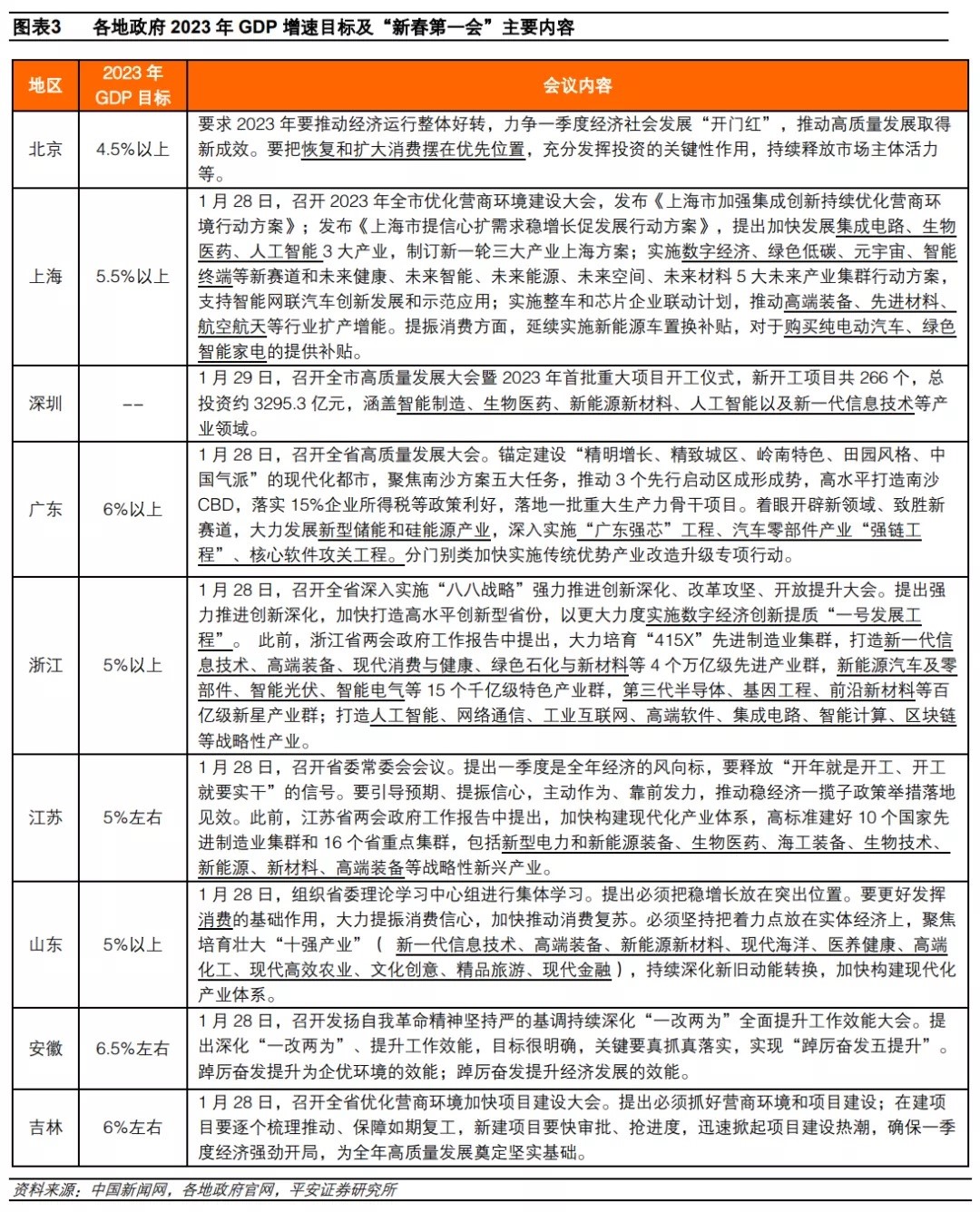 此外,平安證券關注到春節(jié)之后各地政府發(fā)展經(jīng)濟搶跑的跡象,廣東、浙江、安徽、吉林、上海等地都召開了省級層面的“新春第一會”及新一輪優(yōu)化營商環(huán)境行動方案,從部署內容來看,高質量發(fā)展、優(yōu)化營商環(huán)境、重點項目建設等主題是關注的重點。當結合推動高質量發(fā)展、發(fā)展現(xiàn)代產業(yè)體系、統(tǒng)籌發(fā)展和安全、全面深化改革開放、大力提振市場信心、把實施擴大內需戰(zhàn)略同深化供給側結構性改革有機結合起來等關鍵詞看,新一輪政府發(fā)力經(jīng)濟建設,不僅符合中國中長期的發(fā)展規(guī)劃,也符合疫情之后企業(yè)和個人對于美好生活的向往。而行業(yè)層面則看到了諸多政策的優(yōu)化和調整,比如房地產、互聯(lián)網(wǎng)、教育、醫(yī)療、游戲等。中國資本市場在此過程中將推動凝聚中長期預期,2022年提風物長宜放眼量,2023年則是長風破浪會有時,中國經(jīng)濟的韌性、中國企業(yè)的調整能力都會逐步地體現(xiàn)出來。