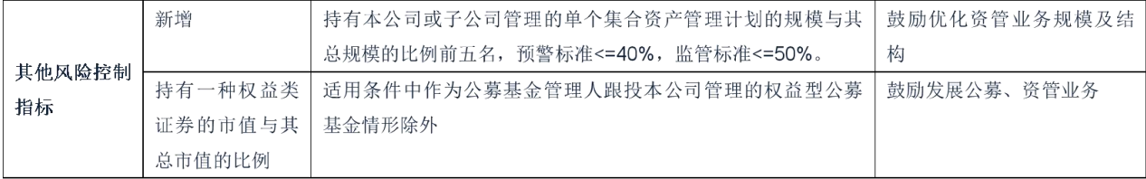 本次正式稿與征求意見稿中各項(xiàng)風(fēng)控指標(biāo)的(風(fēng)險(xiǎn)覆蓋率、資本杠桿率、流動性覆蓋率、凈穩(wěn)定資金率等)的監(jiān)管標(biāo)準(zhǔn)和預(yù)警標(biāo)準(zhǔn)沒有變化,主要變化是計(jì)算上述指標(biāo)的分子分母細(xì)分項(xiàng)目和計(jì)算標(biāo)準(zhǔn)。