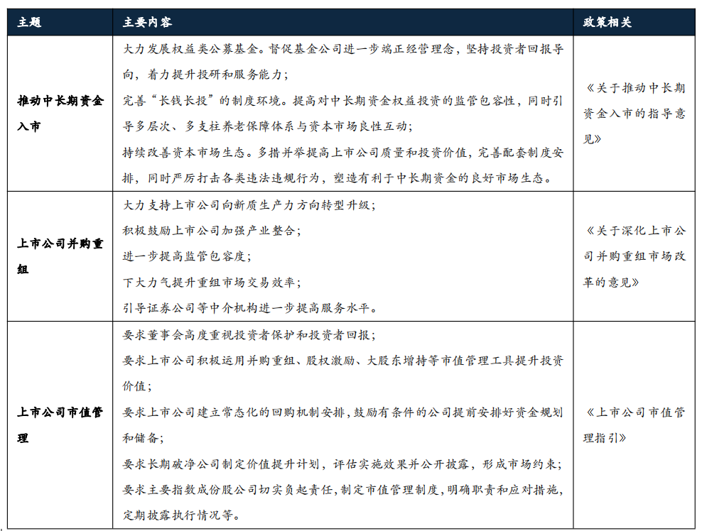 政策支持活躍并購重組、一級市場重現(xiàn)生機(jī)。(1)證監(jiān)會將用好股票、債券、期貨等多種資本市場工具,活躍并購重組市場,將發(fā)布關(guān)于促進(jìn)并購重組的六條措施。積極鼓勵上市公司加強(qiáng)產(chǎn)業(yè)整合,支持上市公司分期發(fā)行股份,提升重組市場交易效率。(2)金融監(jiān)管總局?jǐn)M擴(kuò)大銀行系金融資產(chǎn)投資公司股權(quán)投資試點(diǎn)范圍至18個城市,適當(dāng)放寬股權(quán)投資金額和限制。