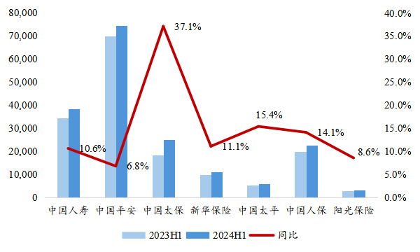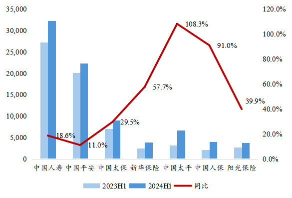 圖1:2024年上半年上市險(xiǎn)企NBV實(shí)現(xiàn)景氣增長(zhǎng)(百萬(wàn)元)