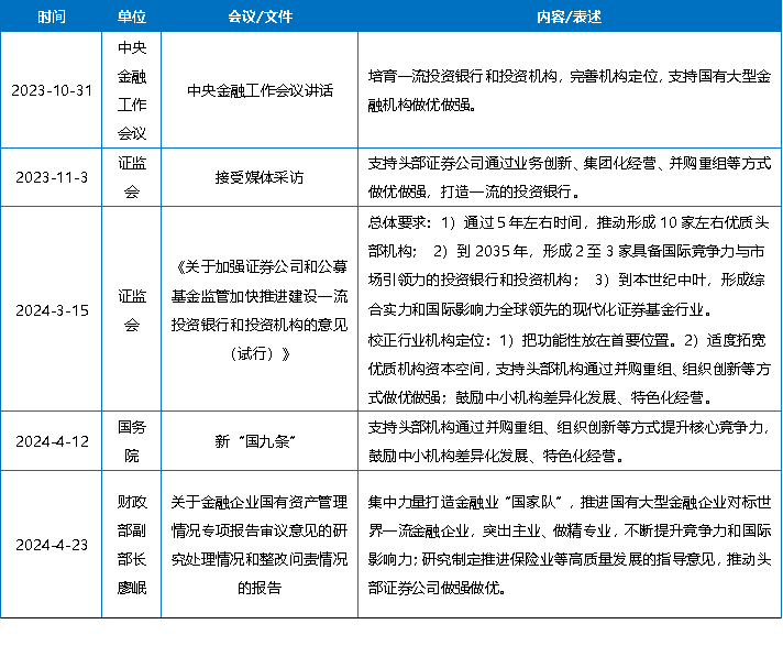 2023年中央金融工作會(huì)議以來(lái),隨著各類(lèi)政策的積極引導(dǎo),券商行業(yè)在更高效地助力資本市場(chǎng)投融資再平衡、公平與效率再平衡方面起到了積極作用。中央金融工作會(huì)議提出加快建設(shè)金融強(qiáng)國(guó)的目標(biāo),明確“優(yōu)化融資結(jié)構(gòu),更好發(fā)揮資本市場(chǎng)樞紐功能”“培育一流投資銀行和投資機(jī)構(gòu)”的要求。資本市場(chǎng)建設(shè)方面,新“國(guó)九條”明確未來(lái)資本市場(chǎng)高質(zhì)量發(fā)展的總體框架,通過(guò)完善各項(xiàng)制度規(guī)則,推動(dòng)投資者合法權(quán)益得到更加有效的保護(hù),投融資結(jié)構(gòu)趨于合理,上市公司質(zhì)量顯著提高,建成具有高度適應(yīng)性、競(jìng)爭(zhēng)力、普惠性的資本市場(chǎng)。而針對(duì)證券行業(yè),政策則支持頭部機(jī)構(gòu)通過(guò)并購(gòu)重組、組織創(chuàng)新等方式提升核心競(jìng)爭(zhēng)力,鼓勵(lì)中小機(jī)構(gòu)差異化發(fā)展、特色化經(jīng)營(yíng),推動(dòng)行業(yè)回歸本源、聚焦功能性發(fā)揮,在服務(wù)實(shí)體經(jīng)濟(jì)、國(guó)家戰(zhàn)略、居民財(cái)富管理等方面發(fā)揮更大專(zhuān)業(yè)作用。