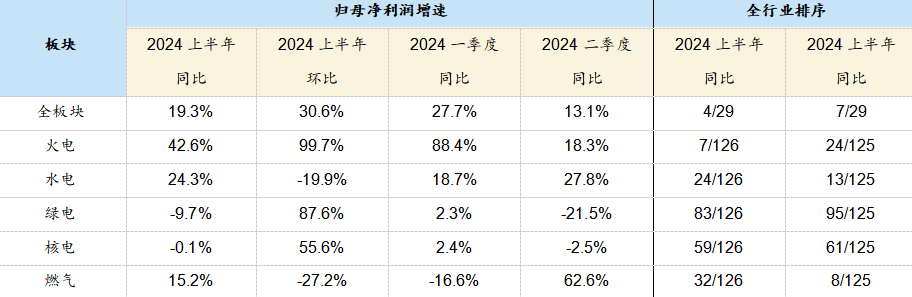公用事業(yè)板塊業(yè)績改善幅度全行業(yè)領(lǐng)先。橫向?qū)Ρ榷裕檬聵I(yè)板塊歸母凈利潤增速在24年上半年同比、24年上半年環(huán)比分別位于全行業(yè)第四(前15%)、第九位(前30%)。從細(xì)分子行業(yè)來看,選取三級(jí)行業(yè)與火電、水電、綠電、核電、燃?xì)膺M(jìn)行對(duì)比,火電、水電業(yè)績同比改善幅度較大,分別位居7/126、24/126,除綠電外其余板塊24年上半年業(yè)績同比改善幅度均位于全行業(yè)的前50%。