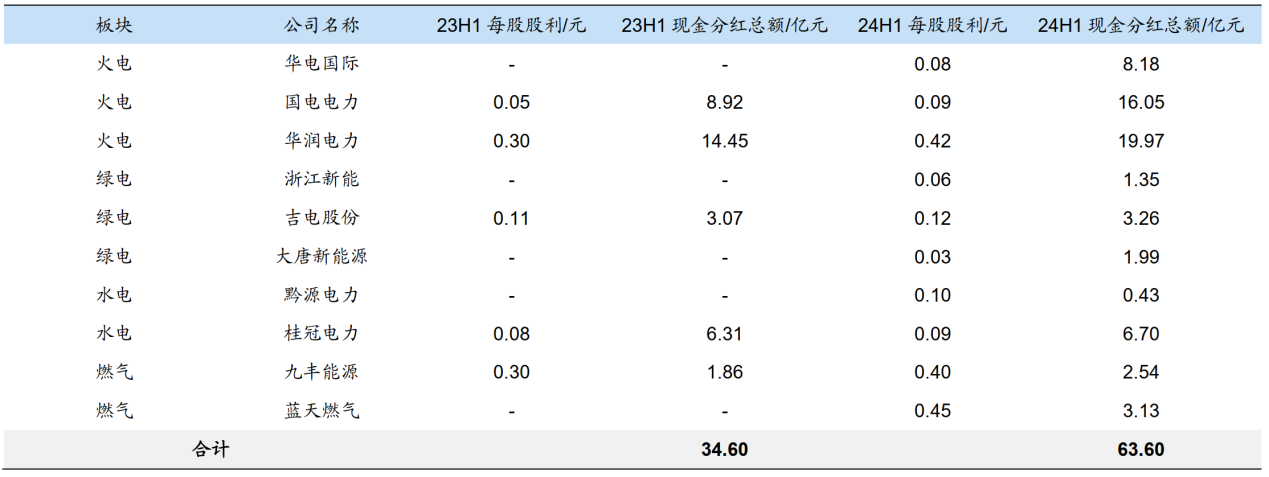 2024年上半年公用事業(yè)板塊實(shí)施中期分紅的公司由5家增至10家,中期分紅的公司累計(jì)現(xiàn)金分紅總額63.60億元,較2023上半年的34.60億元增加83.8%。其中火電公司華潤電力實(shí)施分紅19.97億元(23年同期為14.45億元),國電電力實(shí)施分紅16.05億元(23年同期為8.92億元),分紅提升幅度較大。華電國際、黔源電力、藍(lán)天燃?xì)獾裙拘略鲋衅诜旨t。