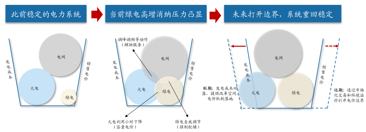 以消納率問題、政治局培訓(xùn)能源安全、綠電裝機(jī)目標(biāo)作為線索,判斷未來火電轉(zhuǎn)型調(diào)節(jié)電源、綠電裝機(jī)增長、電網(wǎng)推動(dòng)建設(shè)是核心,推演出容量電價(jià)、輔助服務(wù)、煤電聯(lián)動(dòng)、環(huán)境價(jià)值等政策預(yù)判;展望未來,憑借發(fā)電成本回落和終端順價(jià),通過先改電價(jià)、再推市場(chǎng)化的步驟,電改或?qū)⒓铀偻瓿伞?/p>