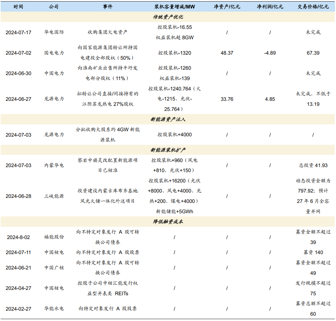 觀察電力資本運(yùn)作加速→判斷行業(yè)景氣度上行:年初至今發(fā)電廠商資產(chǎn)運(yùn)作活躍,主要涉及傳統(tǒng)煤電資產(chǎn)優(yōu)化、新能源裝機(jī)擴(kuò)張及降低融資成本等方面。其中中國電力、國電電力專注于傳統(tǒng)煤電資產(chǎn)的優(yōu)化,華電國際收購集團(tuán)煤電及氣電資產(chǎn);龍?jiān)措娏劢勾蠊蓶|新能源裝機(jī)資產(chǎn)注入;三峽能源、內(nèi)蒙華電推進(jìn)新能源項(xiàng)目核準(zhǔn)建設(shè);中國廣核、中國核電則分別發(fā)行可轉(zhuǎn)債、REITs&定增降低融資成本募資進(jìn)行項(xiàng)目建設(shè)。