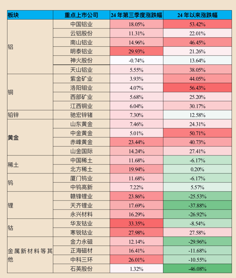 前三季度從需求端來看,國內(nèi)針對性地落地了特別國債帶動的部分基建、制造業(yè)升級、設備更新及數(shù)據(jù)中心等項目,不但充分平滑了地產(chǎn)竣工環(huán)節(jié)的影響,而且?guī)硬糠止┙o剛性的內(nèi)需品步入錯配周期(鋁、鋅等)。隨著0924以來各部委對內(nèi)需預期和中長期流動性的再引導,市場重新修正需求預期,修復強現(xiàn)實的低估內(nèi)需品,因此,綜合前三季度來看鋁、銅等漲幅居前。且第三季度來看,前期受預期及流動性超跌的能源金屬及新材料修復較多,持續(xù)性有望隨內(nèi)需及政策逐步提速。