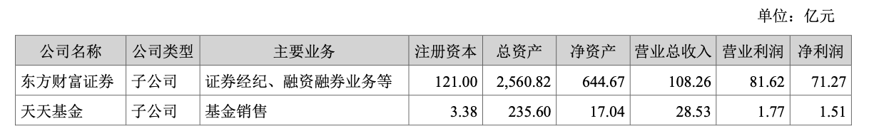 值得關(guān)注的是,東方財富旗下兩大“王牌”子公司東方財富證券股份有限公司(以下簡稱“東方財富證券”)、上海天天基金銷售有限公司(以下簡稱“天天基金”)為其貢獻了不俗的業(yè)績。其中,東方財富證券為東方財富貢獻了108.26億元的營業(yè)收入以及71.27億元的凈利潤;天天基金為東方財富貢獻了28.53億元的營業(yè)收入以及1.51億元的凈利潤。