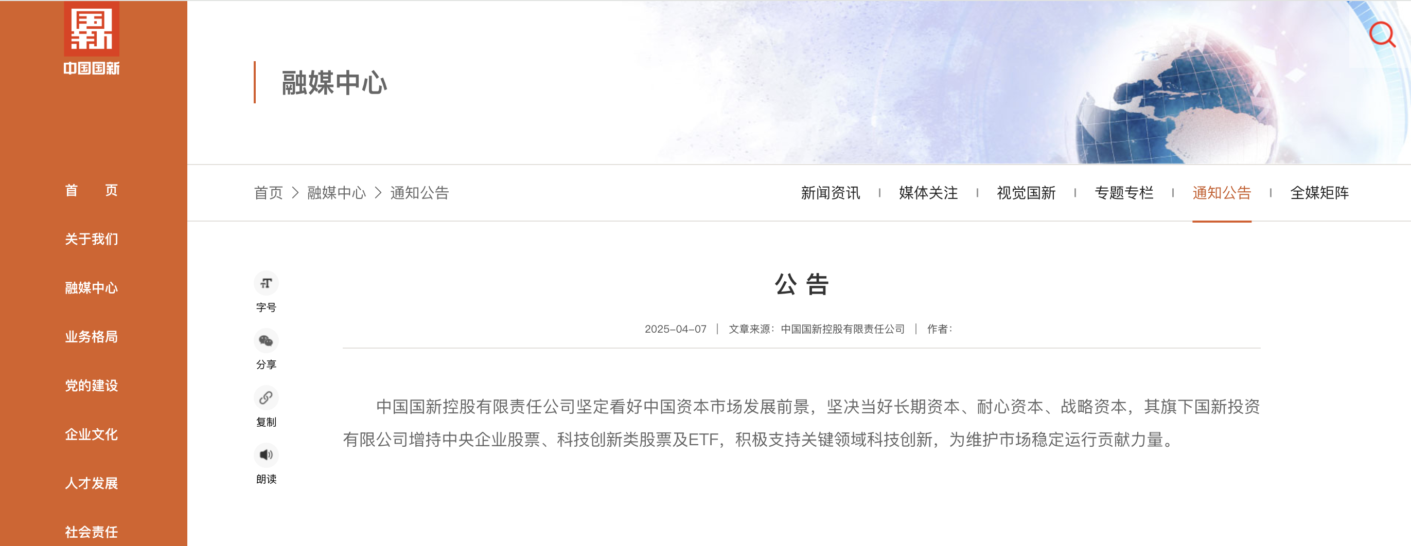 中國國新控股有限責(zé)任公司表示,堅定看好中國資本市場發(fā)展前景,堅決當(dāng)好長期資本、耐心資本、戰(zhàn)略資本,其旗下國新投資有限公司增持中央企業(yè)股票、科技創(chuàng)新類股票及ETF,積極支持關(guān)鍵領(lǐng)域科技創(chuàng)新,為維護市場穩(wěn)定運行貢獻力量。