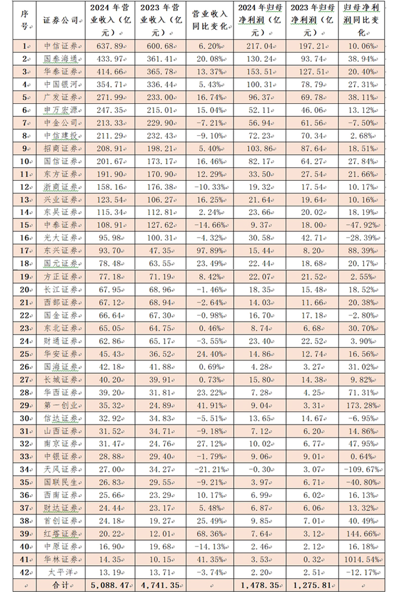 42家上市券商營業(yè)收入及歸母凈利潤情況