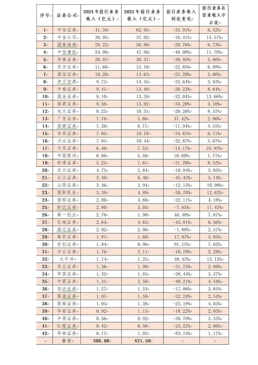 受行業(yè)周期影響,上市券商投行業(yè)務仍未走出低迷。根據(jù)年報數(shù)據(jù),42家上市券商2024年投資銀行業(yè)務共實現(xiàn)手續(xù)費凈收入306.08億元,較2023年的421.58億元,下降27.40%,行業(yè)同比變化中位數(shù)是-25.19%,這反映出投行業(yè)務收入下滑已經(jīng)成為行業(yè)普遍現(xiàn)象。上市券商中,首創(chuàng)證券、第一創(chuàng)業(yè)證券、太平洋證券、廣發(fā)證券、南京證券、中國銀河證券等6家投行業(yè)務收入實現(xiàn)正增長,占比僅為14.29%。國元證券、財達證券等投行業(yè)務收入保持穩(wěn)定,而多數(shù)券商投行業(yè)務則出現(xiàn)較大幅度的下滑。從年報數(shù)據(jù)還能看出,投行業(yè)務收入在上市券商整體收入規(guī)模中占比不高,僅有中金公司、中信建投、國金證券、天風證券、山西證券、財達證券、太平洋證券等少數(shù)上市券商投行收入在營業(yè)收入中占比超10%。