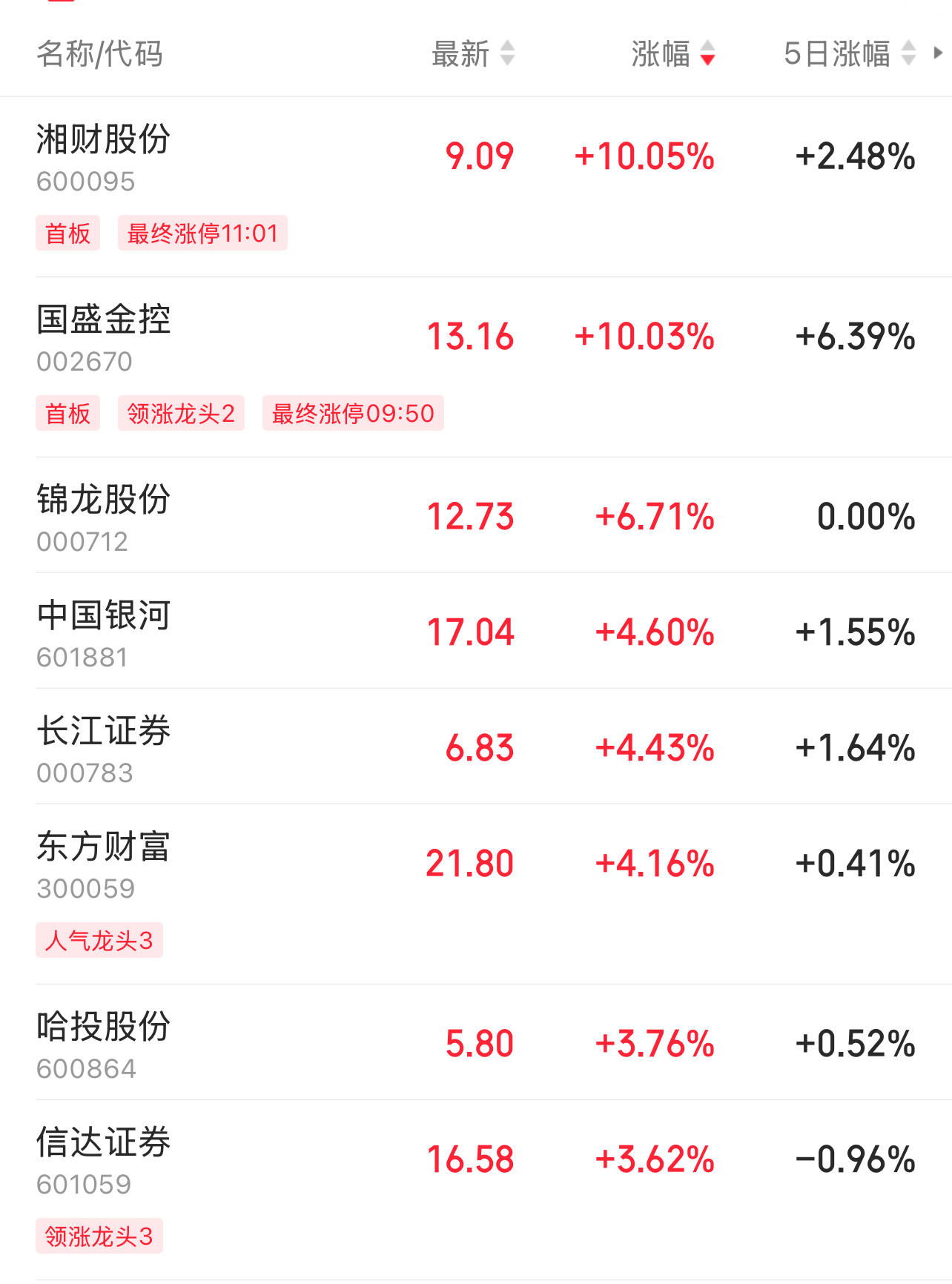 截至午間收盤,證券板塊整體漲幅達2.91%,成交額已突破350億元,達到近期高位,顯示出市場資金對券商板塊的積極關(guān)注與參與。具體來看,板塊內(nèi)個股全面上漲,其中,湘財股份、國盛金控表現(xiàn)最為亮眼,其股價在盤中觸及漲停板;錦龍股份的漲幅也較為可觀,超6%緊隨其后。