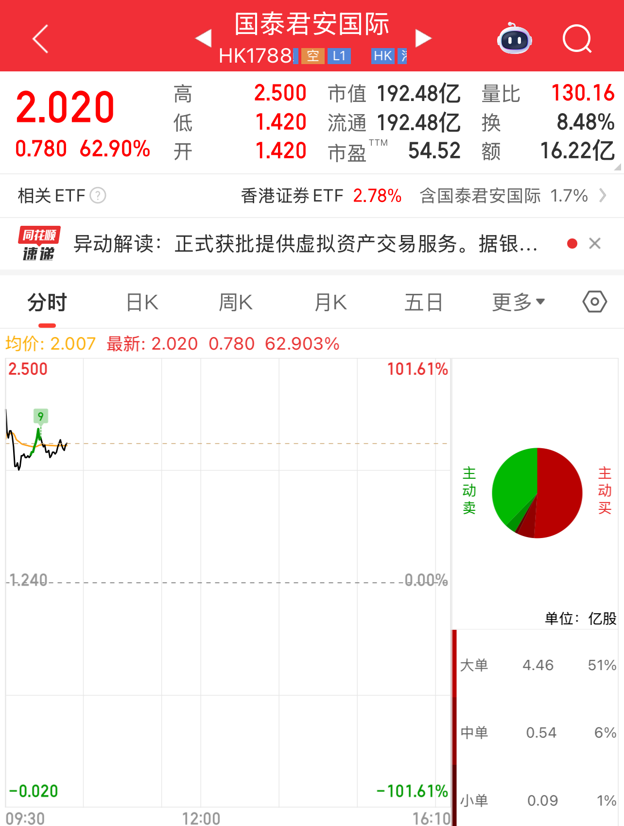 同時,港股中資券商股板塊同樣表現(xiàn)活躍,截至記者發(fā)稿時,板塊漲幅突破8%。國泰君安國際股價今日盤中最高漲幅觸及101.61%,截至發(fā)稿時,該股股價漲幅超60%。