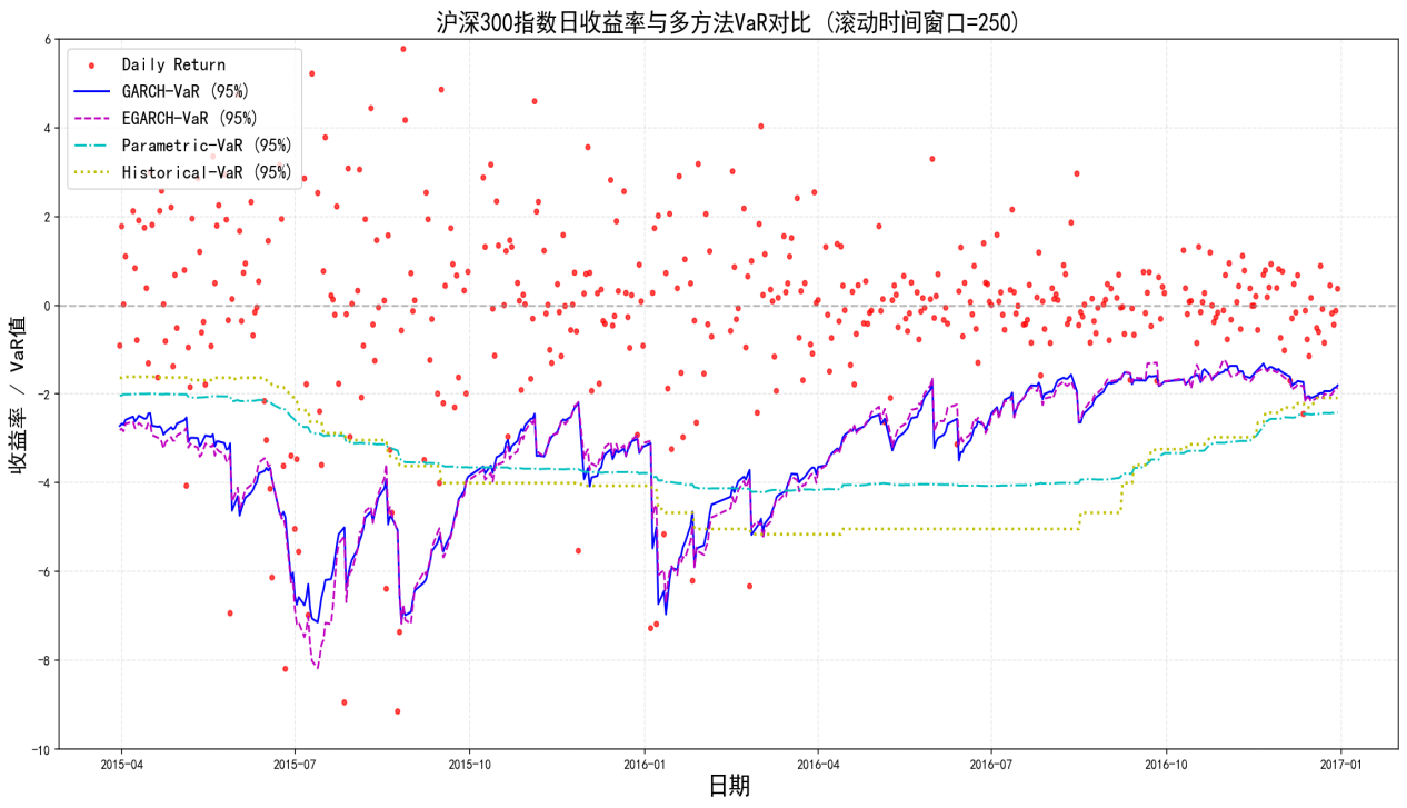 從以上計(jì)量結(jié)果可以看出,在市場劇烈波動(dòng)的時(shí)期(2015-2016),滬深300指數(shù)波動(dòng)率處于較高水平,波動(dòng)聚集和杠桿效應(yīng)顯著增強(qiáng),該時(shí)間段內(nèi)的GARCH類模型在VaR的計(jì)量上顯示出較為明顯的優(yōu)勢,一是在市場出現(xiàn)單日大幅下跌時(shí),GARCH類模型能夠依靠條件方差快速提升VaR值,更及時(shí)地反映潛在風(fēng)險(xiǎn);二是回溯測試的突破次數(shù)更接近理論值,即5%;三是EGARCH模型擅長捕捉負(fù)收益沖擊帶來的波動(dòng)率變化,相比GARCH模型,使VaR對市場下行風(fēng)險(xiǎn)更加敏感,更適用于尾部風(fēng)險(xiǎn)顯著的市場;四是在小幅波動(dòng)聚集時(shí)期,GARCH類模型能夠更快地降低VaR值,使得VaR值不被持續(xù)高估,風(fēng)險(xiǎn)計(jì)量更能貼近市場真實(shí)值。