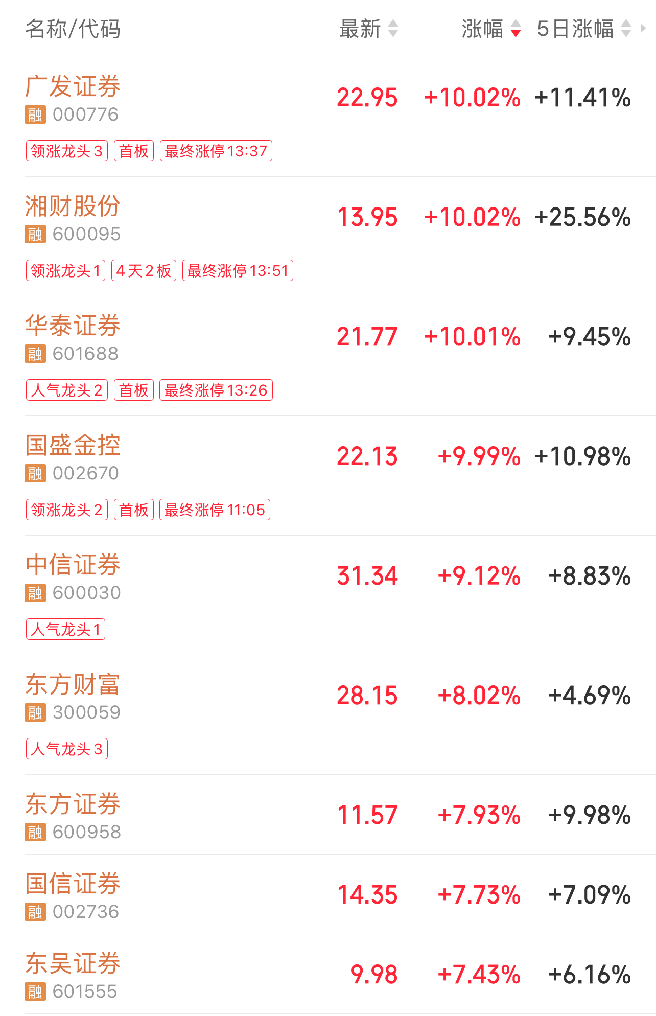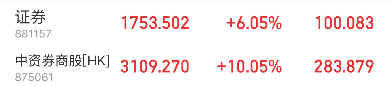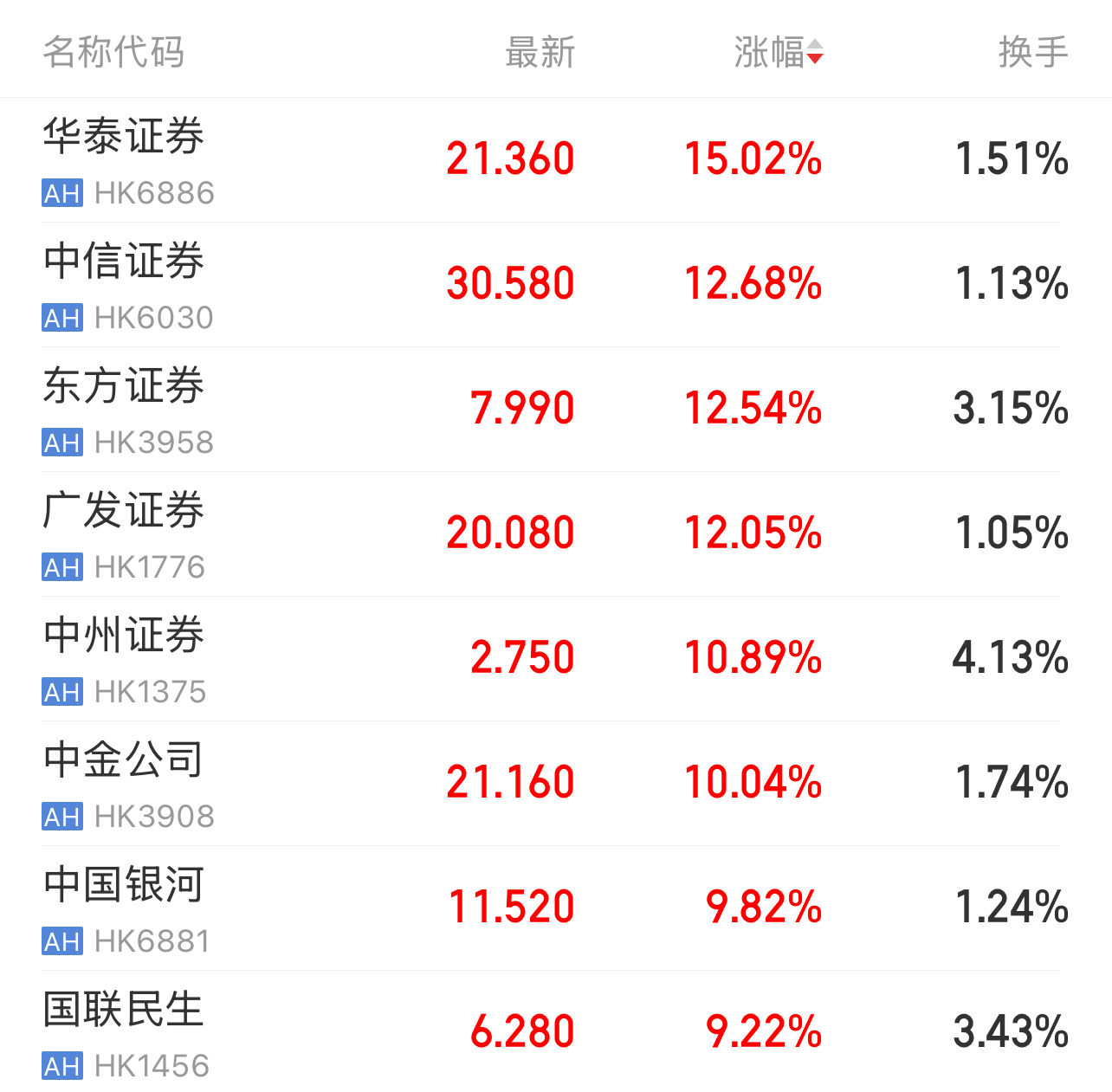 與此同時,港股中資券商板塊爆發(fā),截至記者發(fā)稿時,板塊漲幅已超10%。其中,華泰證券、中信證券、東方證券、廣發(fā)證券、中州證券、中金公司等個股的漲幅均超10%,中國銀河、國聯(lián)民生等個股漲幅也緊隨其后。