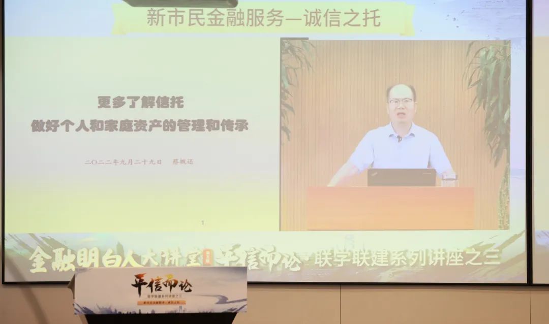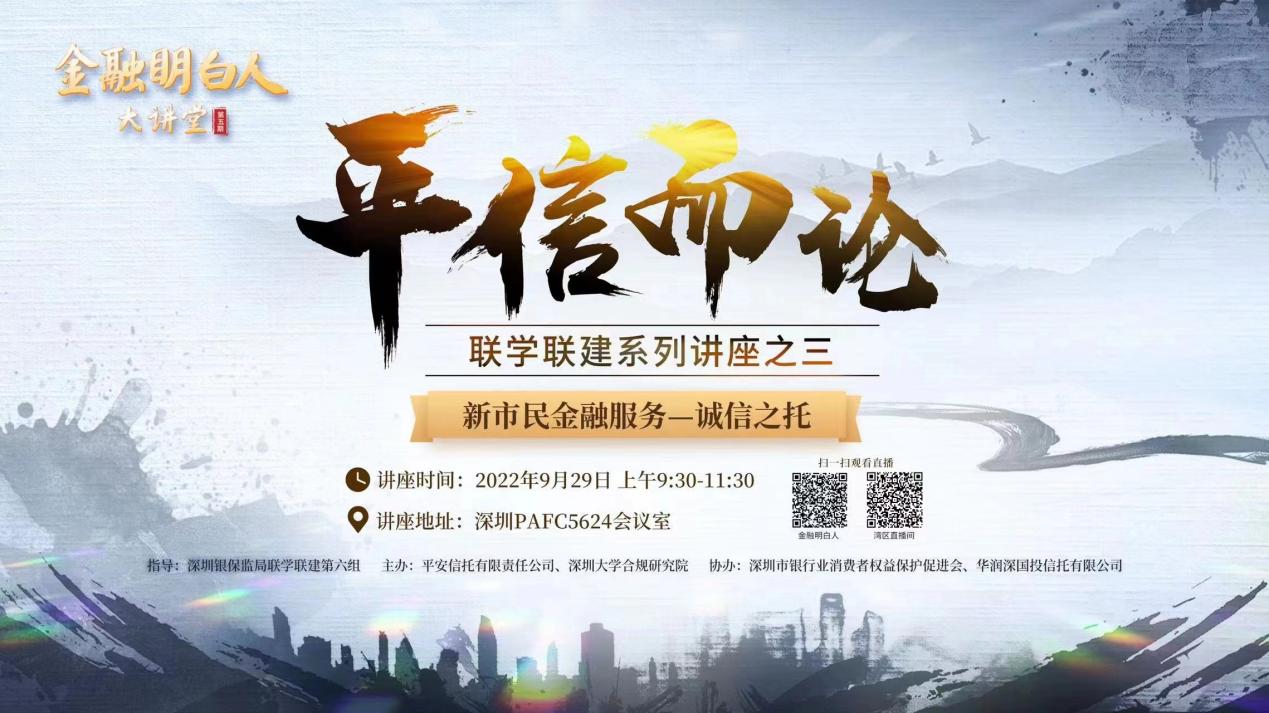 為深入踐行“金融為民、教育為先”的金融教育宣傳理念,向新市民普及信托金融知識,切實提升新市民的獲得感、幸福感和安全感,9月29日,“平信而論”聯(lián)學(xué)聯(lián)建系列講座第三期暨金融明白人大講堂第五期“新市民金融服務(wù)——誠信之托”在深圳成功舉辦。