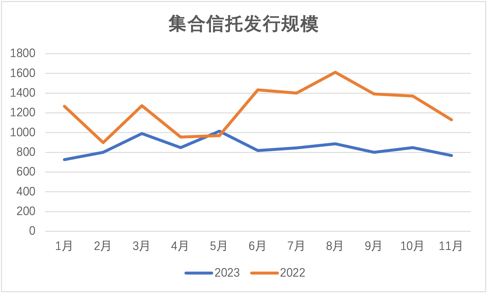 從發(fā)行規(guī)模上看,自2023年5月份達(dá)到1013.2億元的年內(nèi)發(fā)行規(guī)模高點后,此后各月發(fā)行規(guī)模呈現(xiàn)整體波動下行趨勢。11月份,發(fā)行規(guī)模為768.43億元,這也是年內(nèi)第二次單月集合信托發(fā)行規(guī)模低于800億元,創(chuàng)下2023年2月份以來的最低點。另外值得注意的是,今年6月份以來,各月發(fā)行規(guī)模較去年同比均下降超30%。