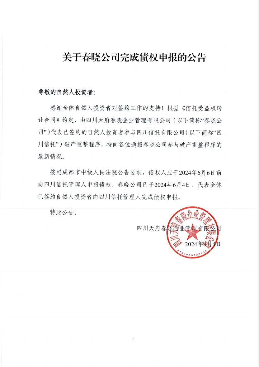 按照成都市中級人民法院公告要求,債權人應于2024年6月6日前向四川信托管理人申報債權。春曉公司已于2024年6月4日,代表全體已簽約自然人投資者向四川信托管理人完成債權申報。