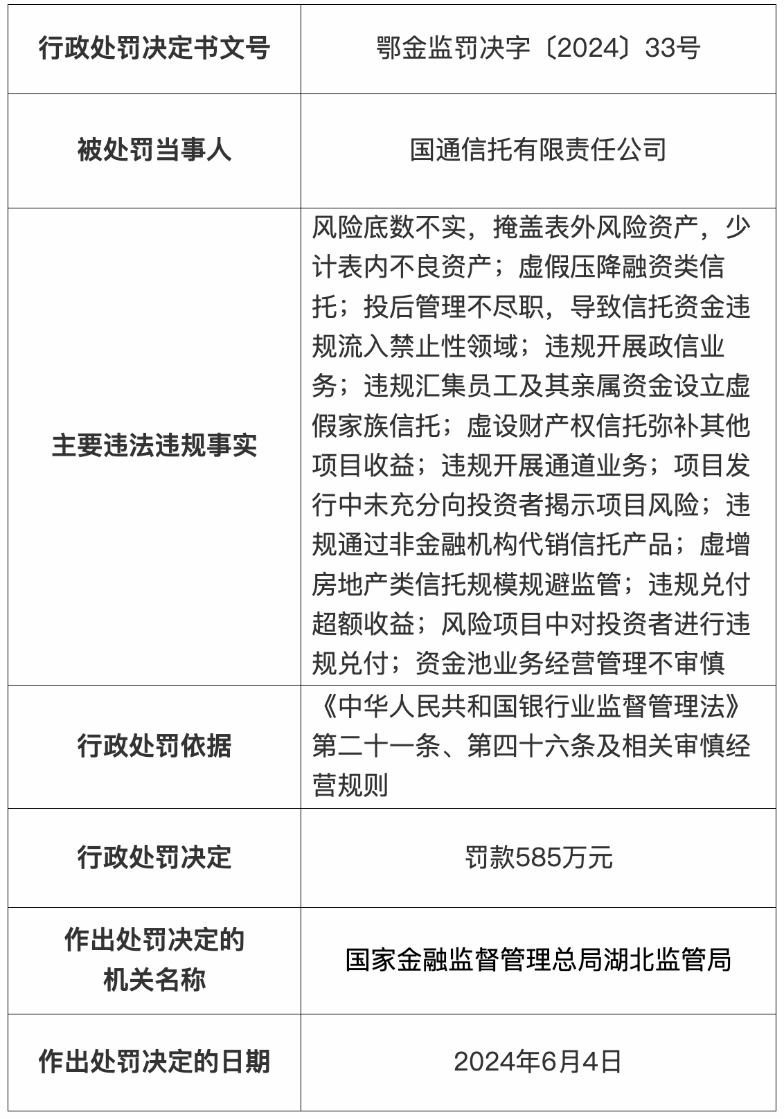 本報訊 (記者張安)6月14日,國家金融監(jiān)督管理總局湖北監(jiān)管局發(fā)布22張罰單,國通信托因13項違法違規(guī)事實被處罰款585萬元。同時,21名相關責任人被處罰,其中18名責任人被處警告,時任國通信托副總裁曹陽等3名責任人被處警告并罰款合計46萬元。