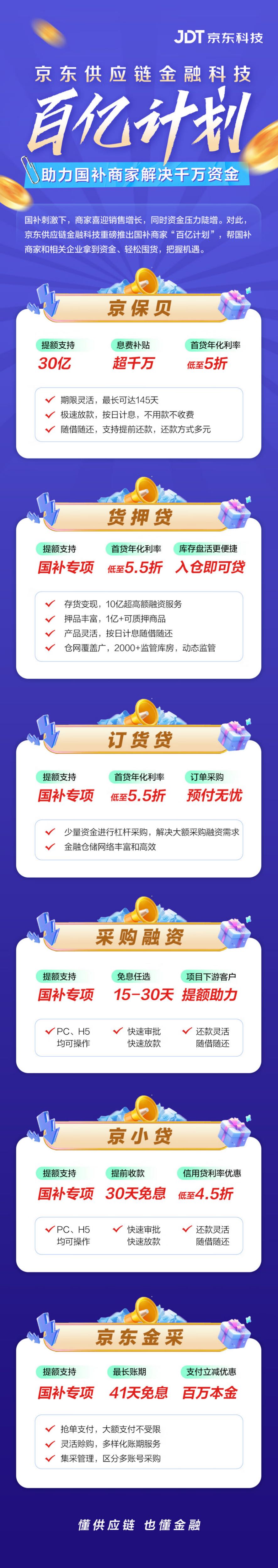 為滿足商家資金需求、抓住國(guó)補(bǔ)銷售機(jī)遇,京東集團(tuán)股份有限公司(以下簡(jiǎn)稱“京東”)供應(yīng)鏈金融科技重磅推出:國(guó)補(bǔ)商家“百億計(jì)劃”——京保貝、貨押貸、訂貨貸、采購(gòu)融資、京小貸、京東金采等產(chǎn)品,為商家提供專項(xiàng)提額和息費(fèi)補(bǔ)貼。