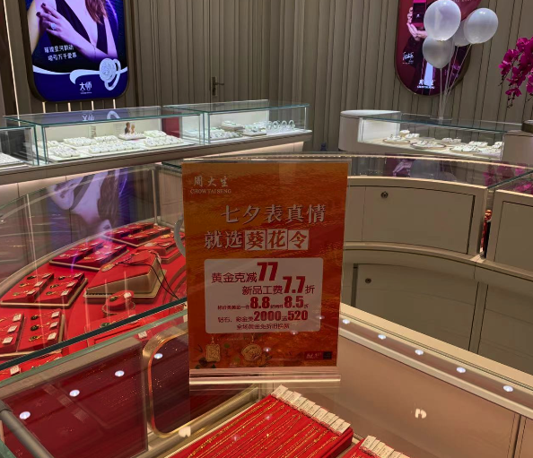 “現(xiàn)在我們的七夕活動(dòng)已經(jīng)開(kāi)始了,店里的足金飾品都有折扣,按克售賣(mài)的飾品每克減77元,按件售賣(mài)的彩金類(lèi)也享受8.8折,還有不少其他的優(yōu)惠都能疊加。”8月1日,《證券日?qǐng)?bào)》記者以消費(fèi)者身份走訪北京一家周大生金店時(shí),銷(xiāo)售人員對(duì)各類(lèi)金飾產(chǎn)品進(jìn)行了熱情的介紹。銷(xiāo)售人員表示,7月份以來(lái)金價(jià)有所下跌,加之臨近七夕節(jié),最近來(lái)選購(gòu)金飾的顧客明顯增多。