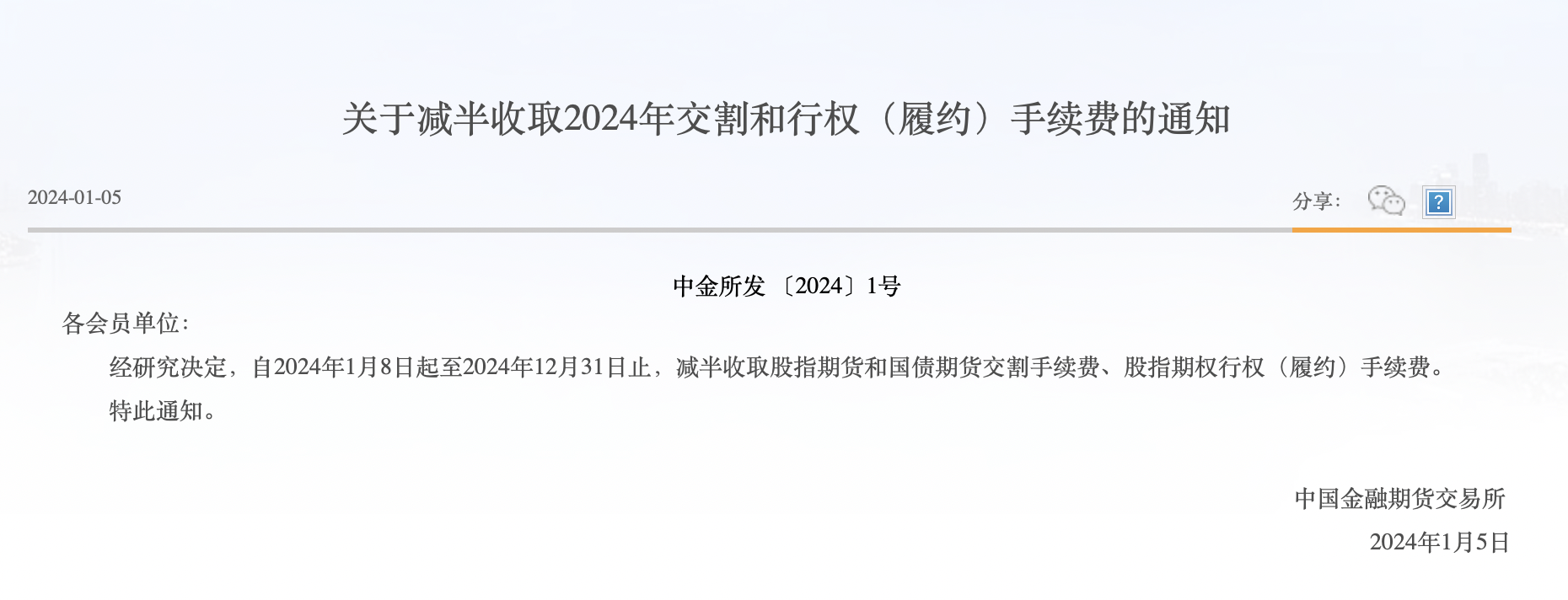 1月5日,中國金融期貨交易所(以下簡稱“中金所”)發(fā)布《關(guān)于減半收取2024年交割和行權(quán)(履約)手續(xù)費的通知》。