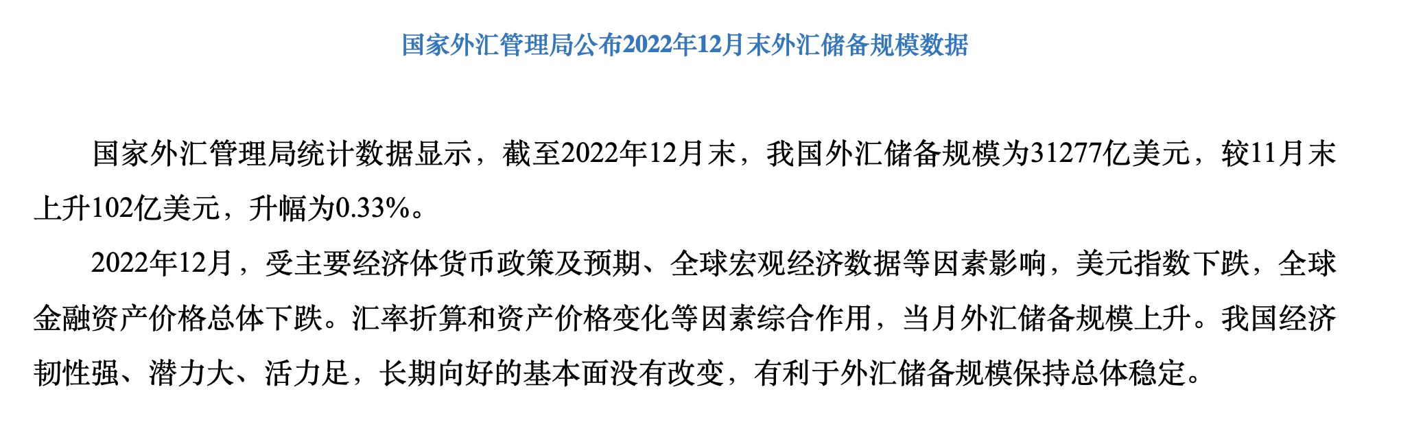 Wind數(shù)據(jù)顯示,截至1月9日18時(shí)30分,美元指數(shù)去年11月份以來(lái)跌幅超7%。值得一提的是,美元指數(shù)的下跌,也利多于我國(guó)外匯儲(chǔ)備。據(jù)國(guó)家外匯管理局1月7日公布的數(shù)據(jù)顯示,截至2022年12月末,我國(guó)外匯儲(chǔ)備規(guī)模為31277億美元,較11月末上升102億美元。同時(shí),外匯儲(chǔ)備規(guī)模也連續(xù)第二個(gè)在3.1萬(wàn)億美元之上。