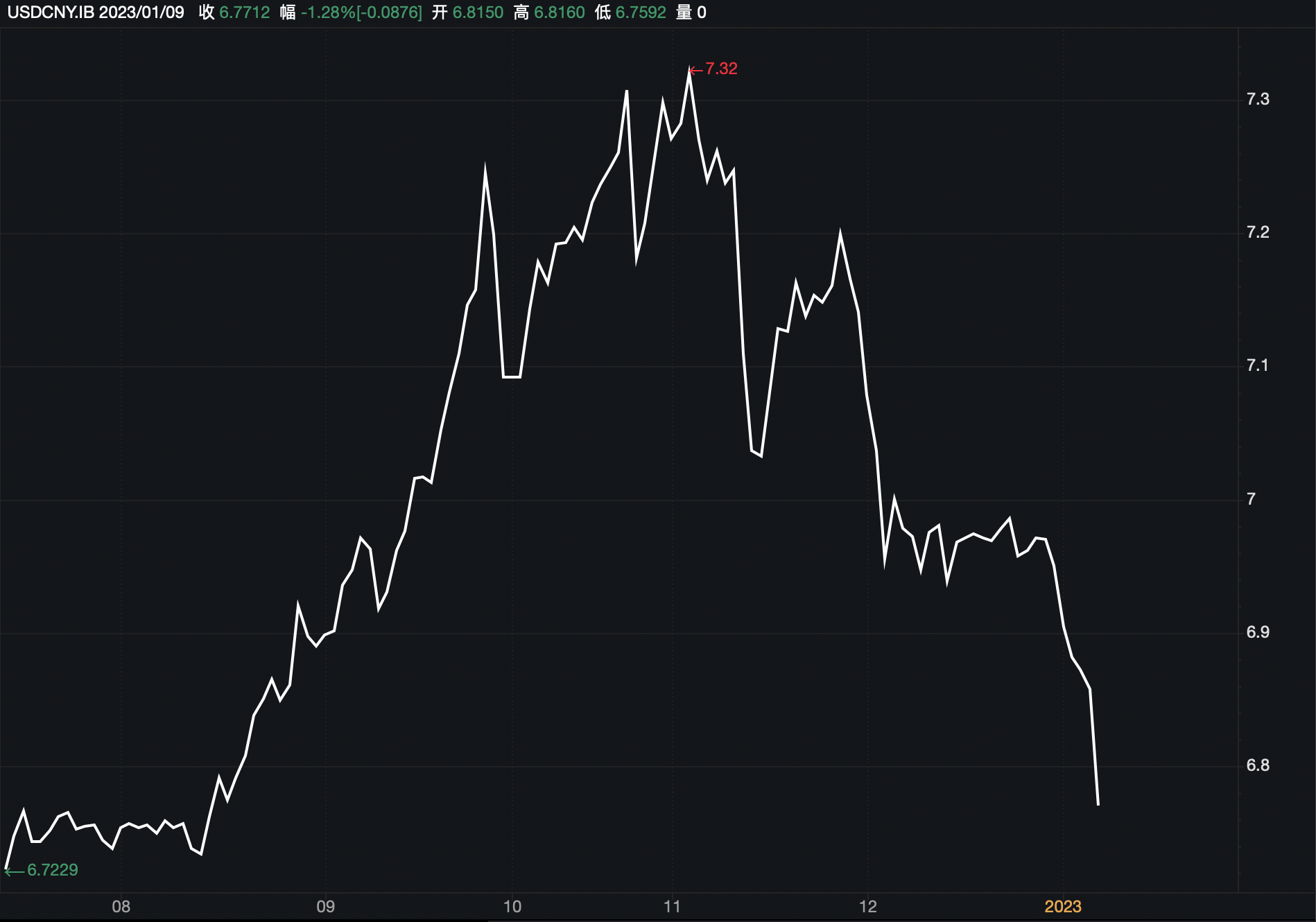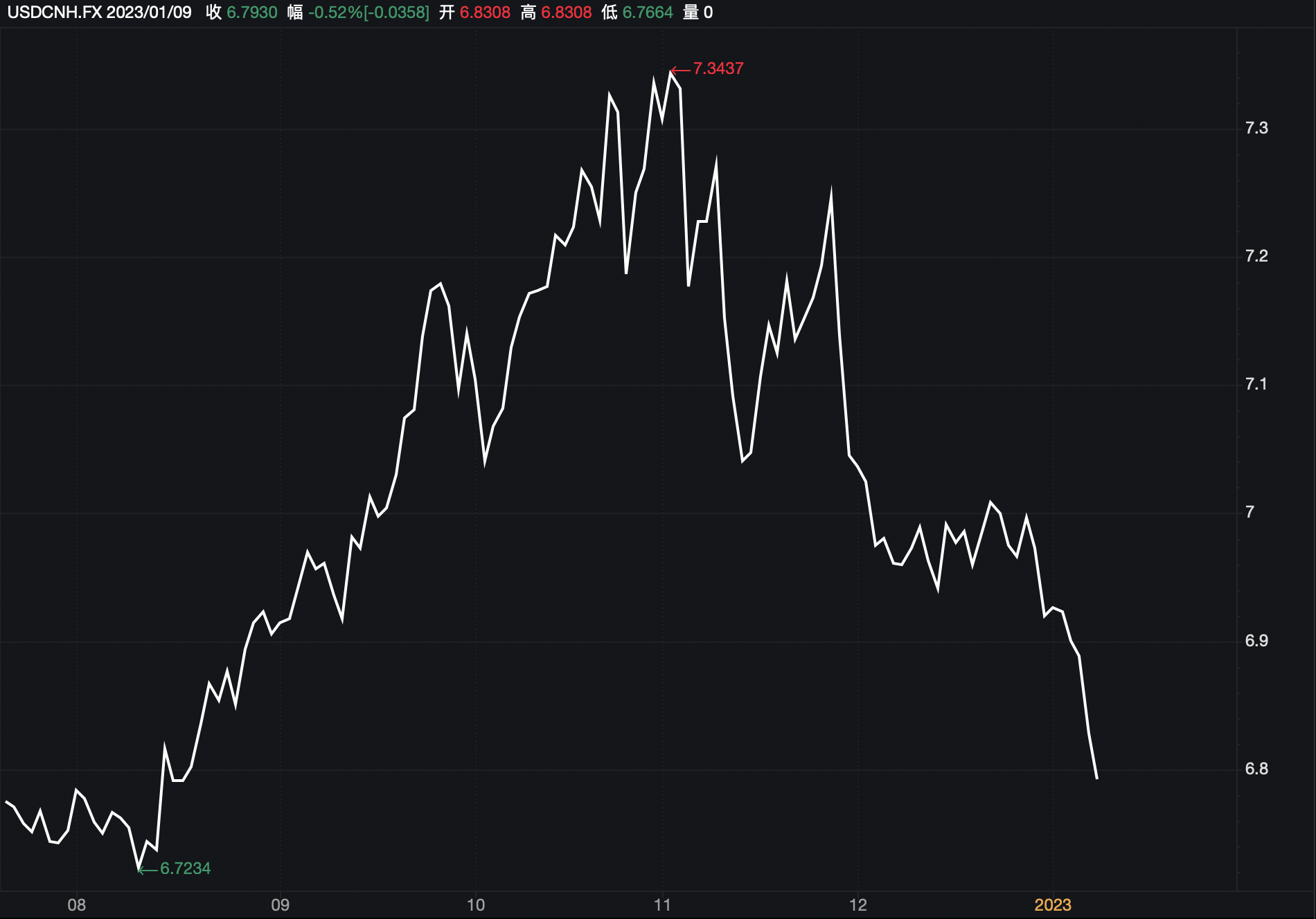 本輪人民幣升值始于2022年11月份。在岸人民幣對(duì)美元匯率由11月1日的低點(diǎn)7.328,一路走強(qiáng)至目前的6.7592,期間累計(jì)上漲超過(guò)5600個(gè)基點(diǎn);離岸人民幣對(duì)美元匯率則由11月1日低點(diǎn)7.3565,最高升至1月9日盤(pán)中的6.7664,期間漲超5900個(gè)基點(diǎn)。