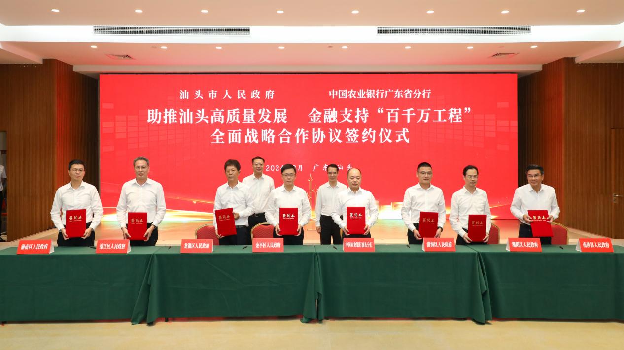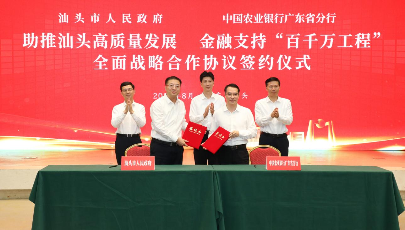 近日,農(nóng)行廣東省分行與汕頭市人民政府簽署《助推汕頭高質(zhì)量發(fā)展金融支持“百千萬工程”全面戰(zhàn)略合作協(xié)議》。
