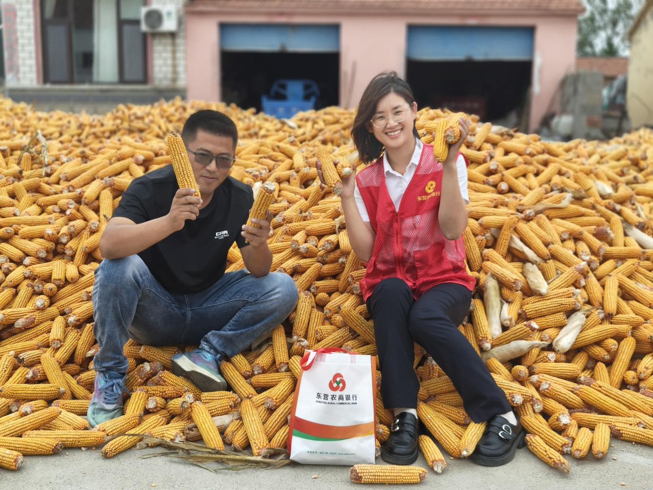 豐收季節(jié),東營農商銀行客戶經理與糧農共享豐收的喜悅 東營農商銀行供圖