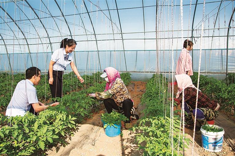 圍場農(nóng)商銀行工作人員向朝陽灣鎮(zhèn)大棚西紅柿種植戶宣傳信貸產(chǎn)品。 圍場農(nóng)商銀行供圖