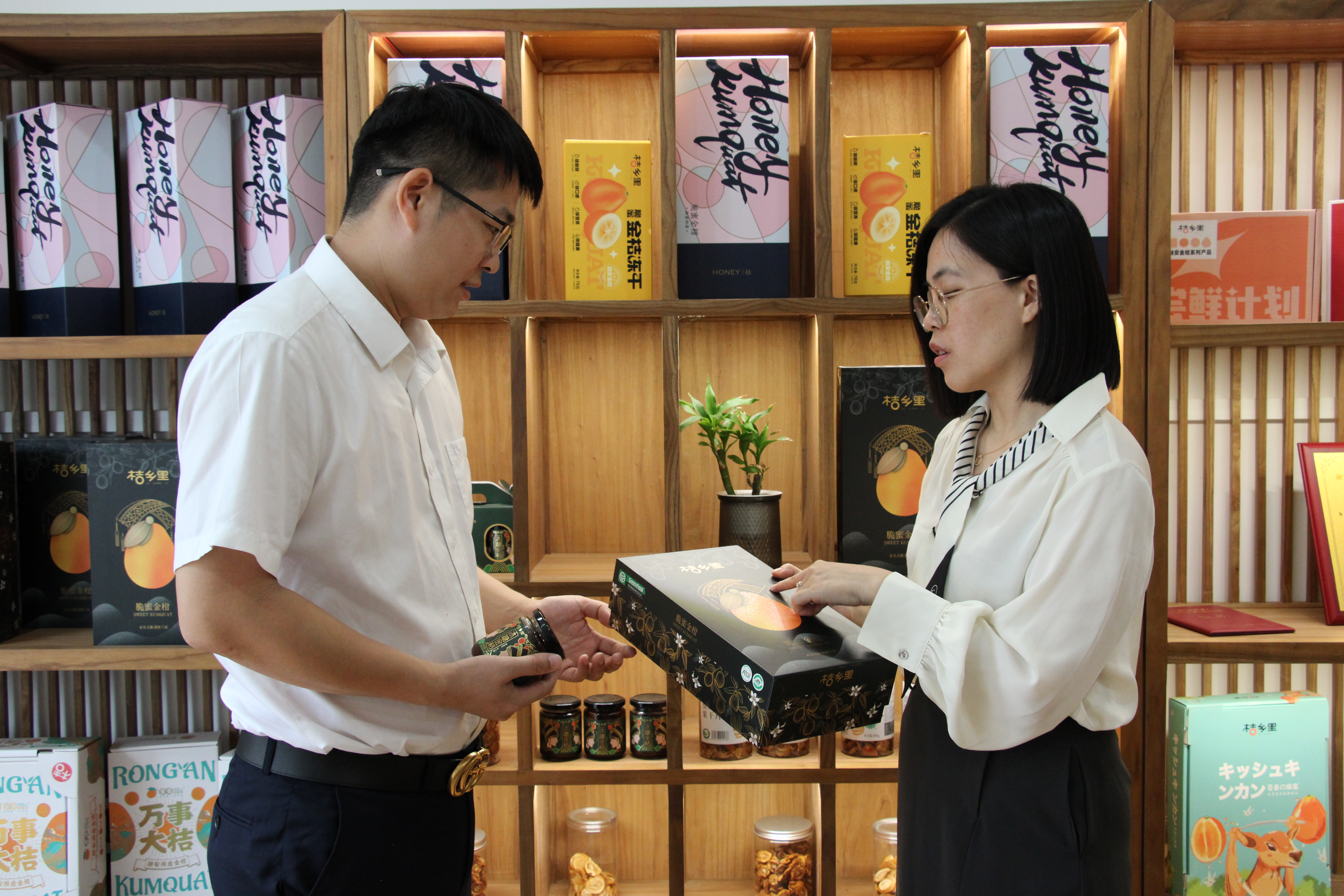 融安農(nóng)商銀行工作人員與廣西融安桔鄉(xiāng)里農(nóng)業(yè)有限公司創(chuàng)始人交談金桔產(chǎn)品細(xì)節(jié) 黃圣鳳/攝
