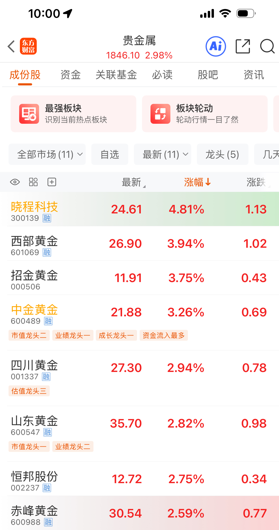 受金價上漲提振,A股早間開盤,貴金屬板塊競價高開,截至記者10點發(fā)稿時,東方財富軟件數(shù)據(jù)顯示,貴金屬板塊指數(shù)大漲2.98%,全板塊11只個股悉數(shù)飄紅;成分股中,曉程科技漲逾4%,中金黃金、西部黃金、招金黃金漲逾3%。
