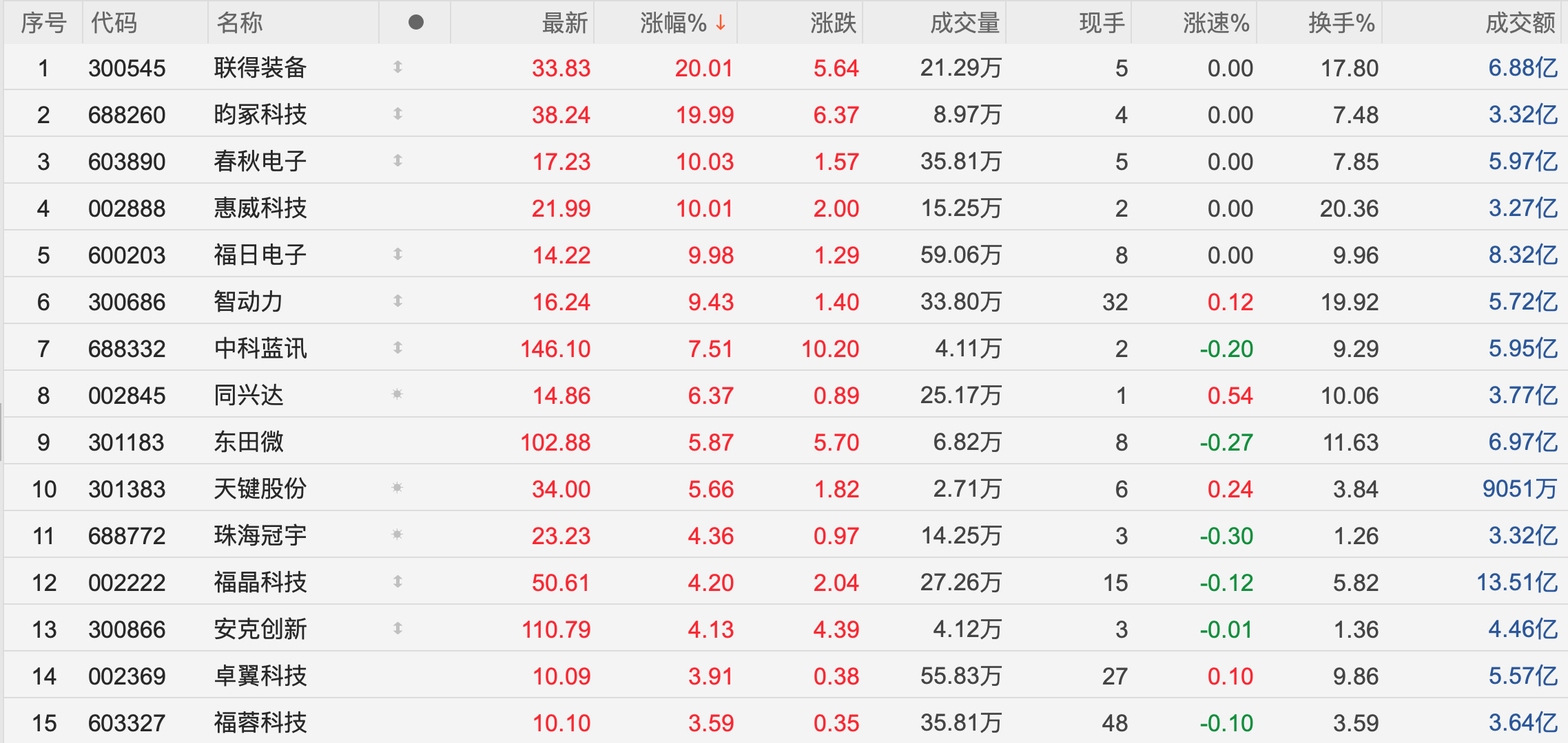11月27日,A股消費電子概念板塊迎來全面爆發(fā),多只個股強勢漲停,板塊整體表現(xiàn)亮眼。截至午間收盤,聯(lián)得裝備(300545.SZ)、昀家科技(688260.SH)、春秋電子(603890.SH)、惠威科技(002888.SZ)和福日電子(600203.SH)漲停。此外,智動力(300686.SZ)、中科藍訊(688332.SH)、同興達(002845.SZ)和東田微(301183.SZ)等個股漲幅也位居前列,板塊內(nèi)多數(shù)個股實現(xiàn)上漲。