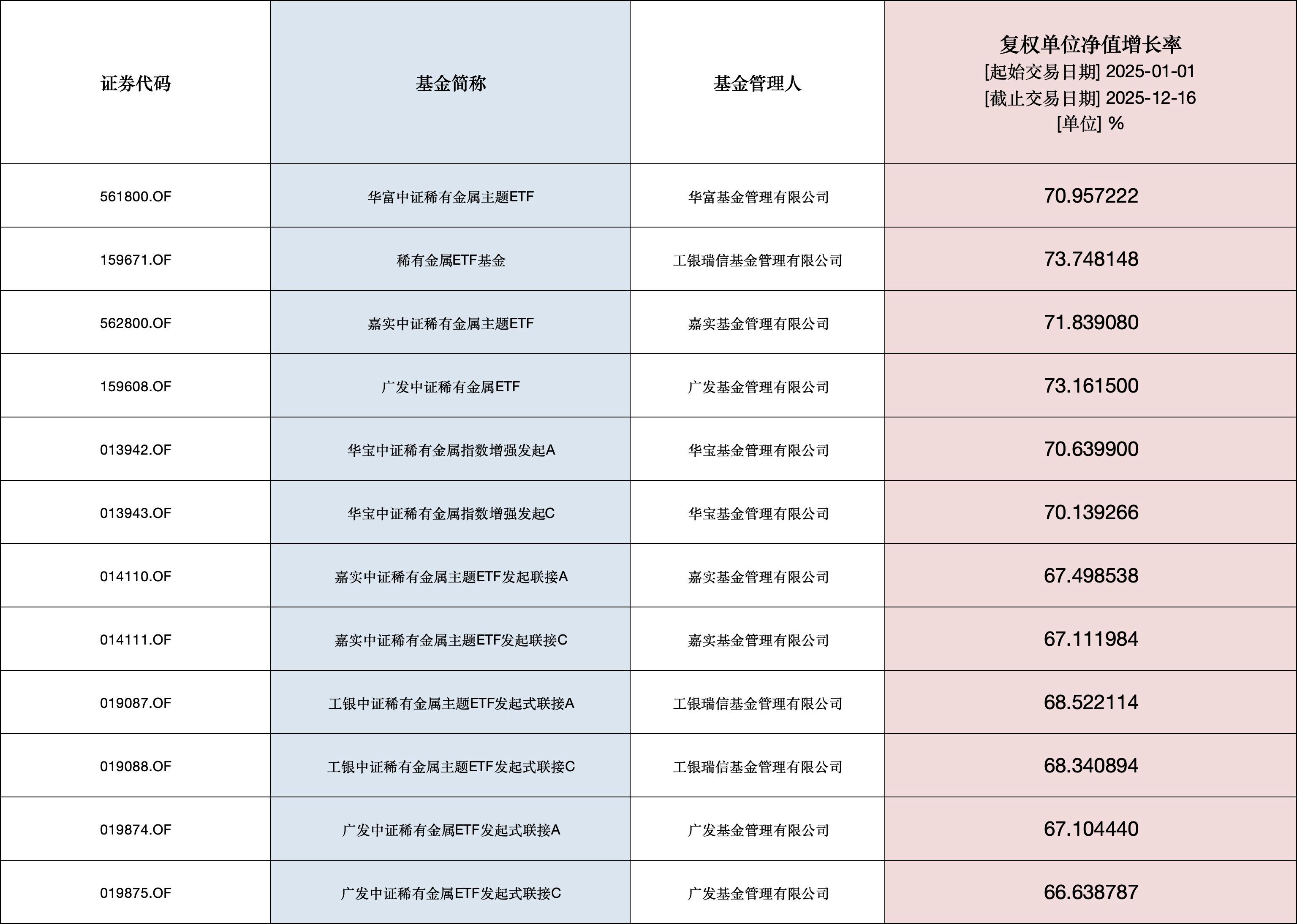 在稀有金屬ETF方面,Wind資訊數(shù)據(jù)顯示,截至12月16日,今年以來12只“稀有金屬ETF”凈值增長率平均達69.64%,表現(xiàn)十分亮眼。其中,華富中證稀有金屬主題ETF、稀有金屬ETF基金、嘉實中證稀有金屬主題ETF、廣發(fā)中證稀有金屬ETF、華寶中證稀有金屬指數(shù)增強發(fā)起A、華寶中證稀有金屬指數(shù)增強發(fā)起C等6只ETF年內(nèi)凈值增長率均超70%。