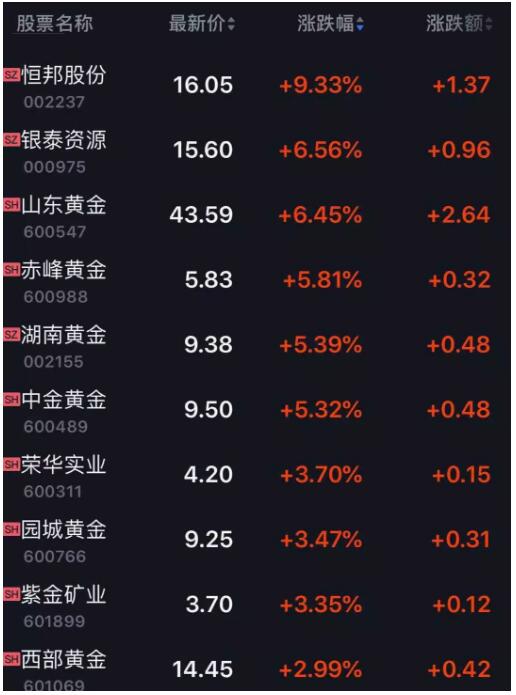 3、避險情緒升溫黃金概念股拉升恒邦股份漲逾9%,銀泰資源、山東黃金漲逾6%,湖南黃金、赤峰黃金、中金黃金等紛紛跟漲。