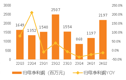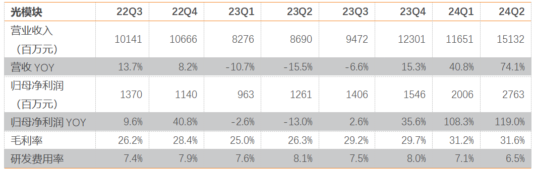 一方面,這一輪人工智能大變革的底層邏輯是大模型&多模態(tài),需要大規(guī)模的數(shù)據(jù)量,因此對(duì)基礎(chǔ)設(shè)施拉動(dòng)非常明顯;另一方面,數(shù)字經(jīng)濟(jì)快速發(fā)展,帶動(dòng)流量快速增長(zhǎng),光模塊屬于數(shù)字經(jīng)濟(jì)發(fā)展的賣水者。光模塊行業(yè)2024Q1和Q2營(yíng)收分別同比增長(zhǎng)40.8%和74.1%,結(jié)束了8個(gè)季度的緩慢發(fā)展(其中連續(xù)3個(gè)季度負(fù)增長(zhǎng)),2023Q4首次恢復(fù)正增長(zhǎng)后,2024上半年逐個(gè)季度加速高增長(zhǎng),Q1和Q2歸母凈利同比增速分別為+108.3%和119.0%,反映全球AI拉動(dòng)光模塊需求全面進(jìn)入高增長(zhǎng),目前主要受益海外,未來有望受益國(guó)內(nèi)算力需求增長(zhǎng),因此趨勢(shì)有望延續(xù)多個(gè)季度。