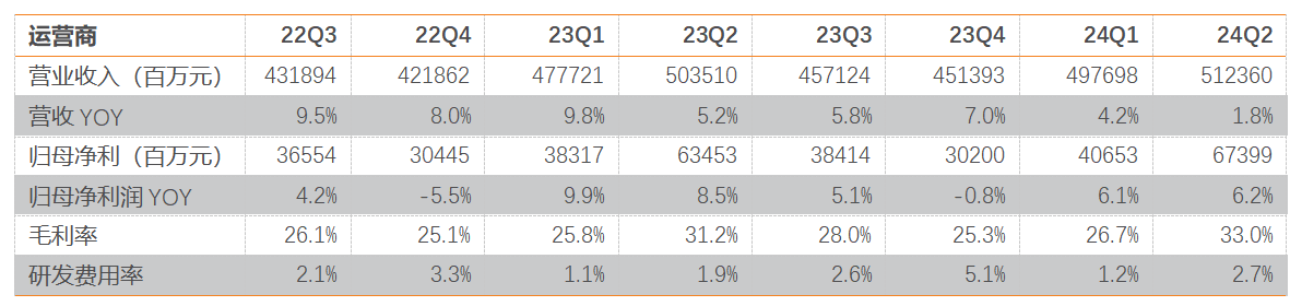 運(yùn)營(yíng)商2024Q2收入增長(zhǎng)1.8%,從2023Q4的7%到2024Q1的4%到Q2逐季放緩,主要原因arpu值壓力,但是利潤(rùn)端從2023Q4的-1%到2024Q1的6.1%到24Q2的6.2%保持穩(wěn)健增長(zhǎng),說明壓力可控,且由于中國(guó)通信arpu值只有全球均值一半&占人民收入約1%,展望未來數(shù)年有望穩(wěn)中有升,因此預(yù)計(jì)業(yè)績(jī)保持平穩(wěn)增長(zhǎng)。