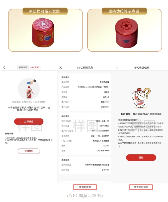 NFC溯源:2023年10月份,貴州茅臺(tái)酒啟用新膠帽,膠帽內(nèi)嵌入RFID電子標(biāo)簽,生產(chǎn)日期在2023年10月16日及以后且?guī)履z帽的貴州茅臺(tái)酒,可通過(guò)“i茅臺(tái)App—我的—溯源”進(jìn)入“NFC溯源”頁(yè)面后,用帶NFC功能的手機(jī)靠近膠帽即可獲取溯源信息。