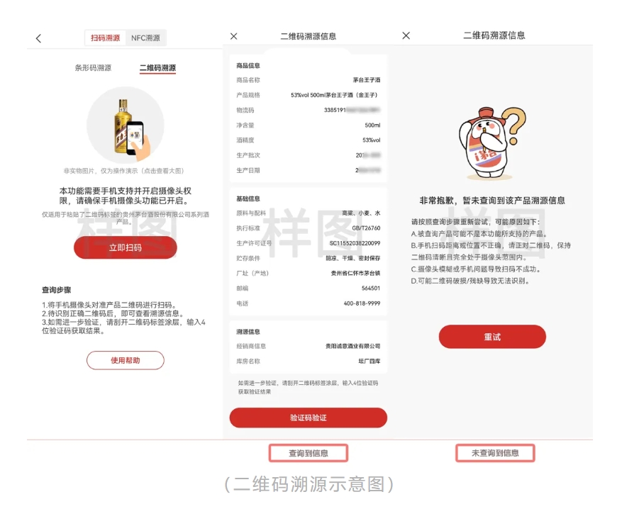 但是大家知道,無(wú)論是條形碼還是二維碼都是以明碼方式貼在瓶身上的,存在容易被復(fù)制、被轉(zhuǎn)移的風(fēng)險(xiǎn),通過(guò)掃描復(fù)制品或者移動(dòng)后的條形碼或二維碼也能得到溯源信息。因此,小茅提醒親們,條形碼和二維碼溯源方式僅適用于真實(shí)產(chǎn)品的溯源,讓親們能了解產(chǎn)品從包裝生產(chǎn)到終端的相關(guān)流通信息。