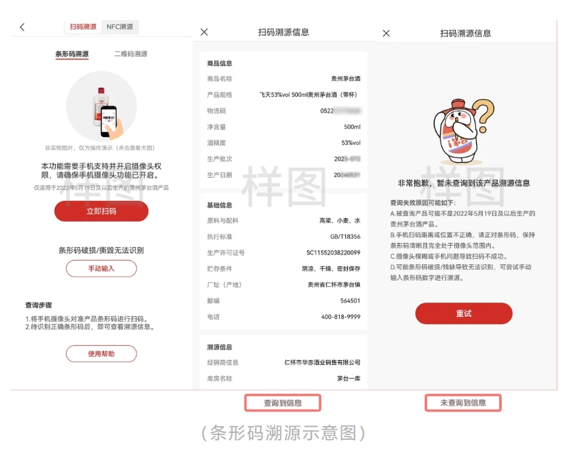 掃碼溯源:一是條形碼溯源,2022年5月19日及以后生產(chǎn)且粘貼了條形碼標(biāo)簽的貴州茅臺(tái)酒產(chǎn)品可通過(guò)“i茅臺(tái)App—我的—溯源”進(jìn)入“條形碼掃碼”頁(yè)面獲取產(chǎn)品的溯源信息。二是二維碼溯源,2025年1月15日及以后生產(chǎn)的茅臺(tái)王子酒(金王子)可通過(guò)“i茅臺(tái)App—我的—溯源”進(jìn)入“二維碼掃碼”頁(yè)面獲取產(chǎn)品的溯源信息。