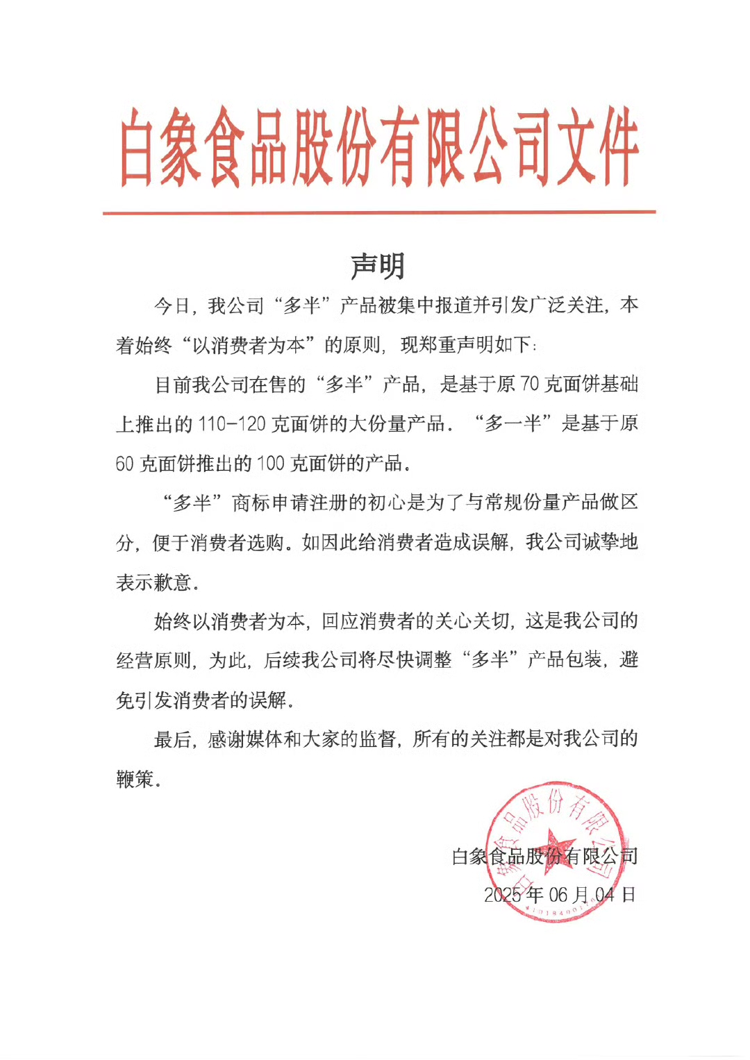 6月4日晚,白象食品發(fā)布聲明稱,目前公司在售的“多半”產(chǎn)品,是基于原70克面餅基礎(chǔ)上推出的110—120克面餅的大份量產(chǎn)品。“多一半”是基于原60克面餅推出的100克面餅的產(chǎn)品。“多半”商標(biāo)申請注冊的初心是為了與常規(guī)份量產(chǎn)品做區(qū)分,便于消費者選購。白象食品表示,后續(xù)公司將盡快調(diào)整“多半”產(chǎn)品包裝,避免引發(fā)消費者的誤解。
