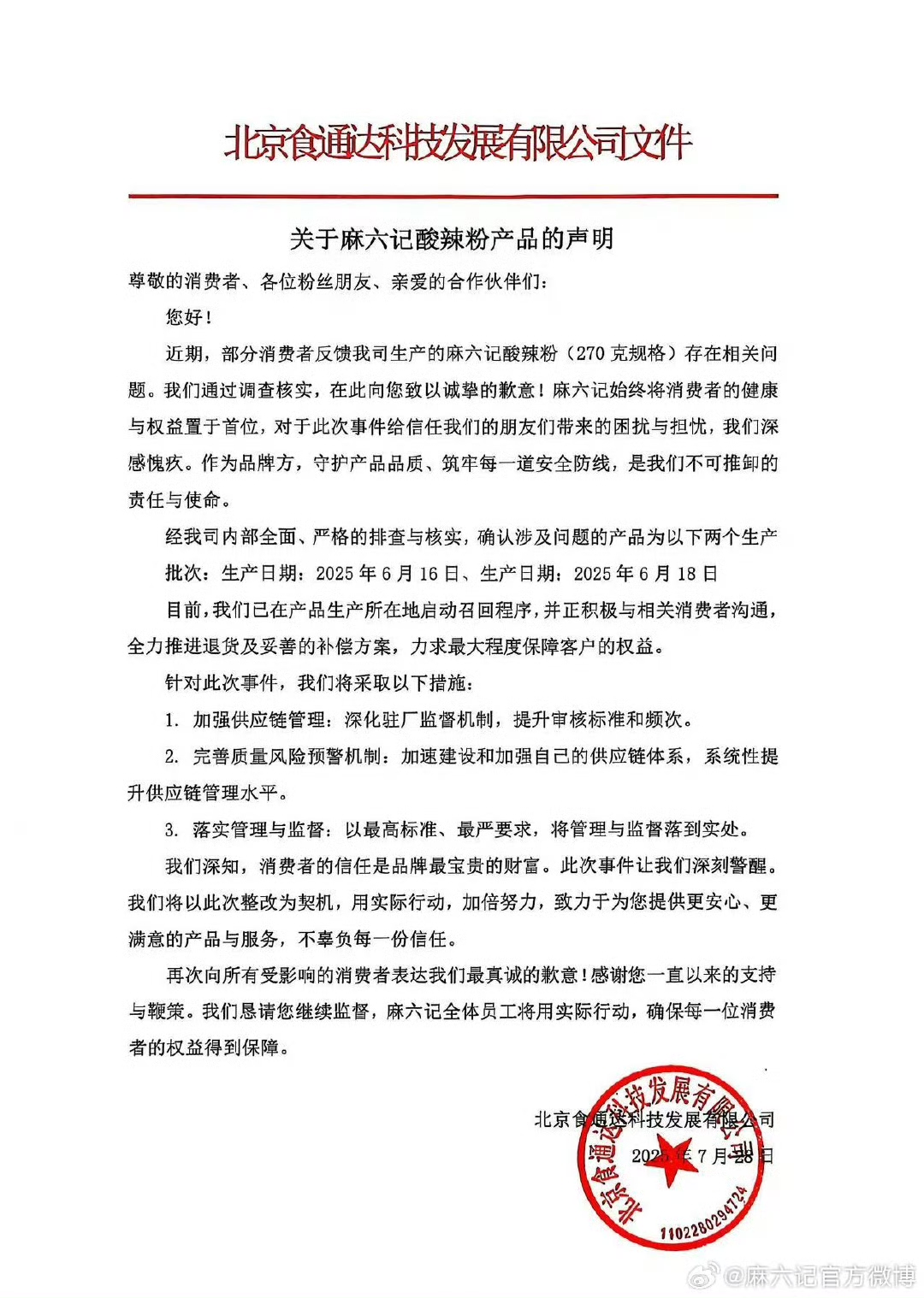 本報(bào)訊 (記者李靜)7月28日下午,麻六記官方微博發(fā)表聲明道歉,稱經(jīng)公司內(nèi)部排查與核實(shí),確認(rèn)涉及問題的產(chǎn)品為生產(chǎn)日期為2025年6月16日、6月18日的兩個(gè)生產(chǎn)批次。麻六記稱,目前,公司已在產(chǎn)品生產(chǎn)所在地啟動(dòng)召回程序,并正積極與相關(guān)消費(fèi)者溝通,全力推進(jìn)退貨及妥善的補(bǔ)償方案,力求最大程度保障客戶的權(quán)益。