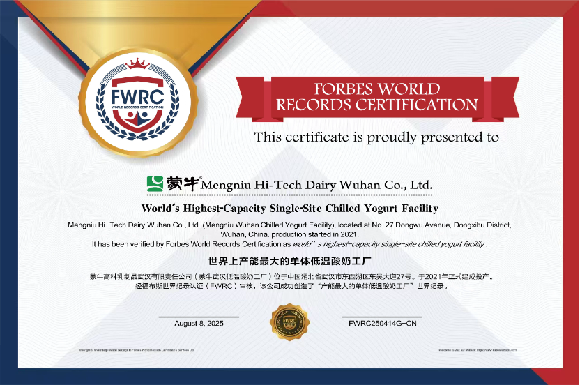 發(fā)布會上,FWRC福布斯世界紀錄認證官本·科特宣布蒙牛低溫武漢工廠榮獲“世界上產能最大的單體低溫酸奶工廠”認證,并現場頒發(fā)證書。該項權威認證不僅是對其世界級規(guī)模與智能化水平的充分肯定,更是中國乳業(yè)以創(chuàng)新驅動發(fā)展、引領新質生產力建設的里程碑式成就。