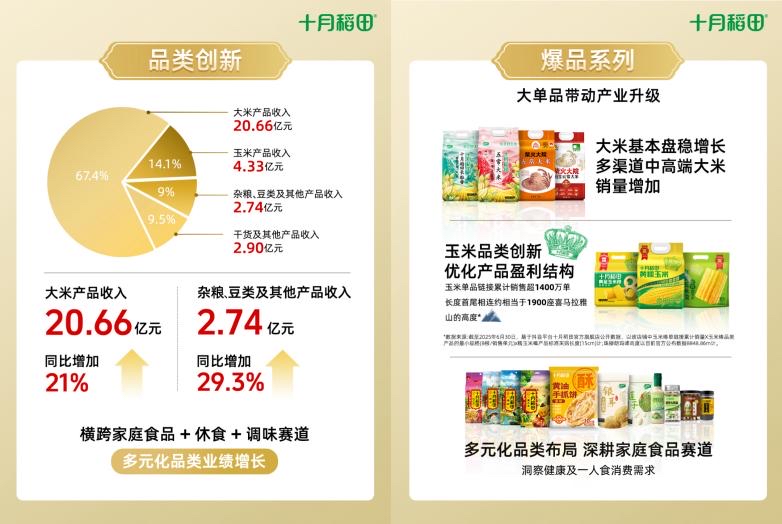 報告期內(nèi),十月稻田核心品類穩(wěn)健增長,多元品類布局成效顯著。大米產(chǎn)品作為核心業(yè)務(wù),營收達到20.66億元,同比增長21.0%;玉米品類營收4.33億元;雜糧、豆類及其他產(chǎn)品收入同比增加29.3%至2.74億元。