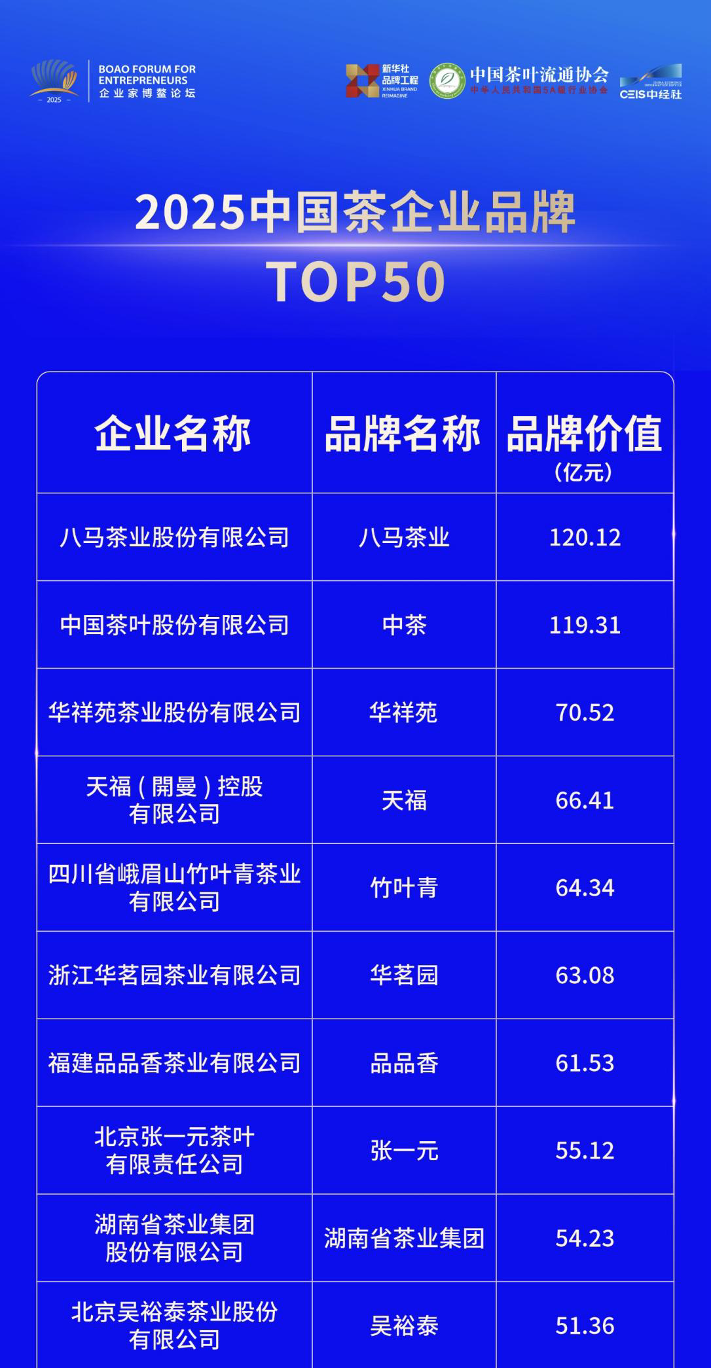 而“2025中國茶企業(yè)品牌調(diào)查結(jié)果TOP50”調(diào)查由新華社中國經(jīng)濟(jì)信息社、中國茶葉流通協(xié)會共同發(fā)起,秉持“科學(xué)、公開、公正、公認(rèn)、公益”原則,依據(jù)現(xiàn)行品牌評價標(biāo)準(zhǔn)體系,充分結(jié)合品牌帶動力、市場領(lǐng)導(dǎo)力、品牌研發(fā)力等多維度調(diào)查,重點考量品牌在品質(zhì)、創(chuàng)新、服務(wù)等方面的表現(xiàn),對2100余家茶葉代表進(jìn)行科學(xué)分析評價。