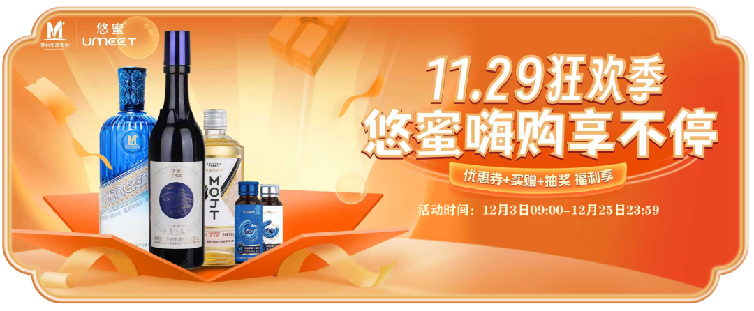 12月3日09:00-12月25日23:59,開啟“11·29狂歡季 悠蜜嗨購(gòu)享不停”活動(dòng)。上i茅臺(tái)App買悠蜜產(chǎn)品,為甜蜜加碼:①領(lǐng)券立減:10000張滿減券大放送,可用于購(gòu)買悠蜜藍(lán)莓精釀?dòng)鲆?middot;藍(lán)雪、UMEET靛嵐藍(lán)莓蒸餾酒40%vol等產(chǎn)品。②多買多贈(zèng):莫其托貴州味道系列雞尾酒藍(lán)莓酸“買一贈(zèng)一”、umeet二倍濃縮藍(lán)莓汁(復(fù)原)“買五贈(zèng)三”。③幸運(yùn)抽獎(jiǎng):購(gòu)買任意悠蜜活動(dòng)產(chǎn)品,抽500/200/100元抵扣券。有i有禮,甜甜蜜蜜。