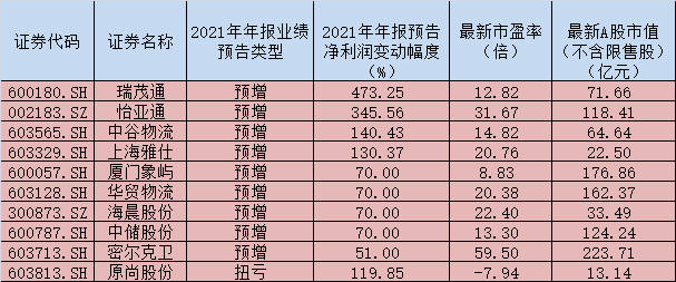 此外,物流行業(yè)喜報(bào)迭出。在已披露的2021年年報(bào)預(yù)告的13家公司中,共有12家公司業(yè)績表現(xiàn)預(yù)喜。其中,瑞茂通、怡亞通、中谷物流、上海雅仕、原尚股份等5家公司凈利潤有望實(shí)現(xiàn)同比翻番。