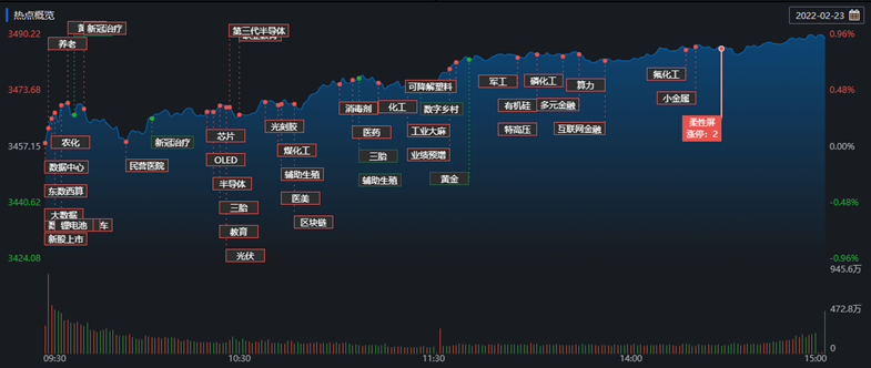 盤面來看,截至2月23日收盤,上證指數(shù)漲0.93%,深證成指漲1.9%,創(chuàng)業(yè)板指漲2.82%;滬深兩市合計成交額10409億元,突破一萬億元;總體來看,兩市個股普漲,有3608只個股上漲,其中有104只個股漲停報收。